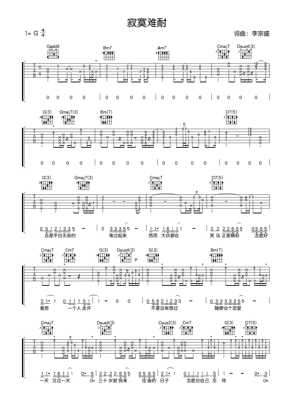 《寂寞难耐》吉他谱_李宗盛_G调原版弹唱谱六线谱...