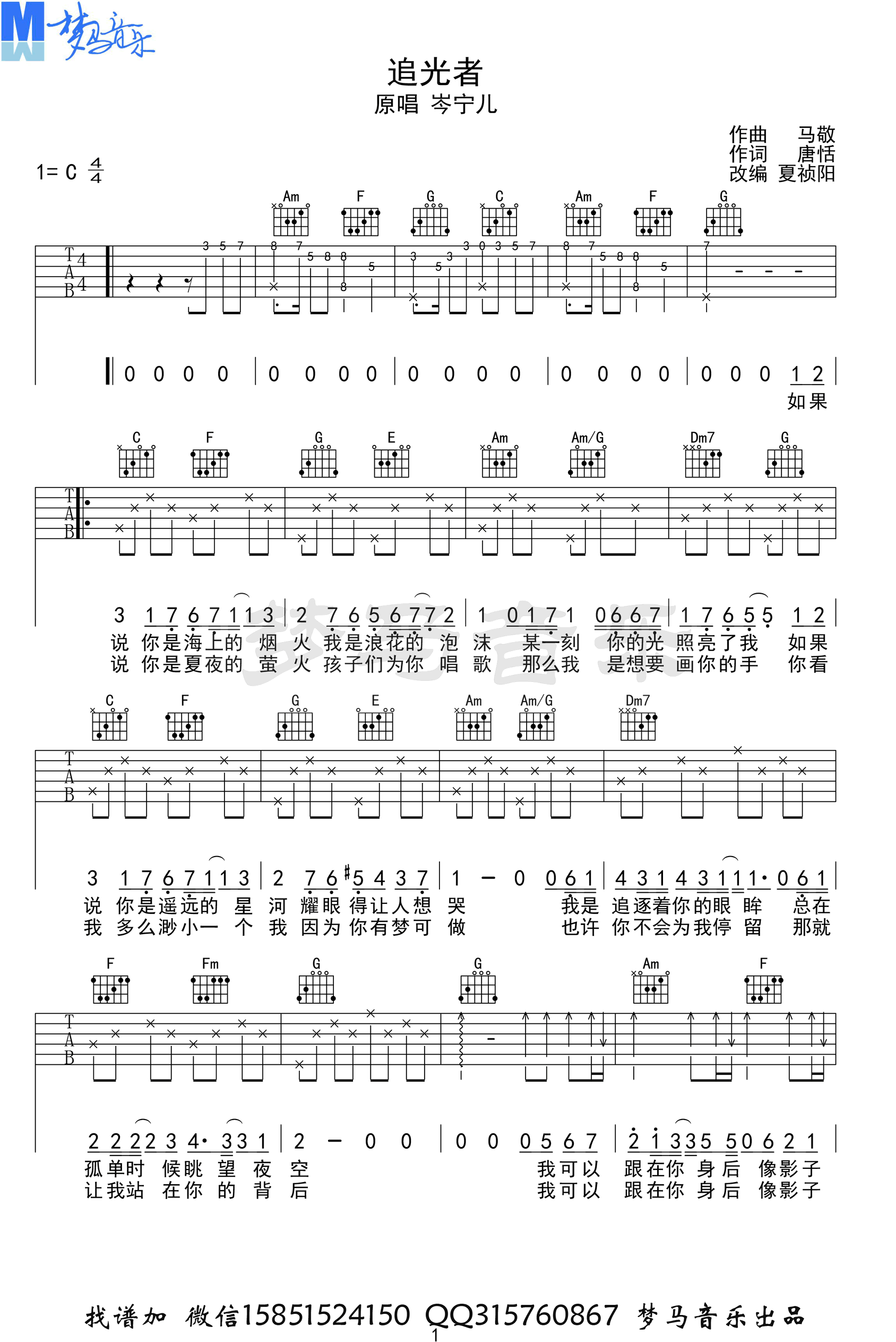 《追光者》吉他谱_岑宁儿_C调男生版弹唱谱六线谱...