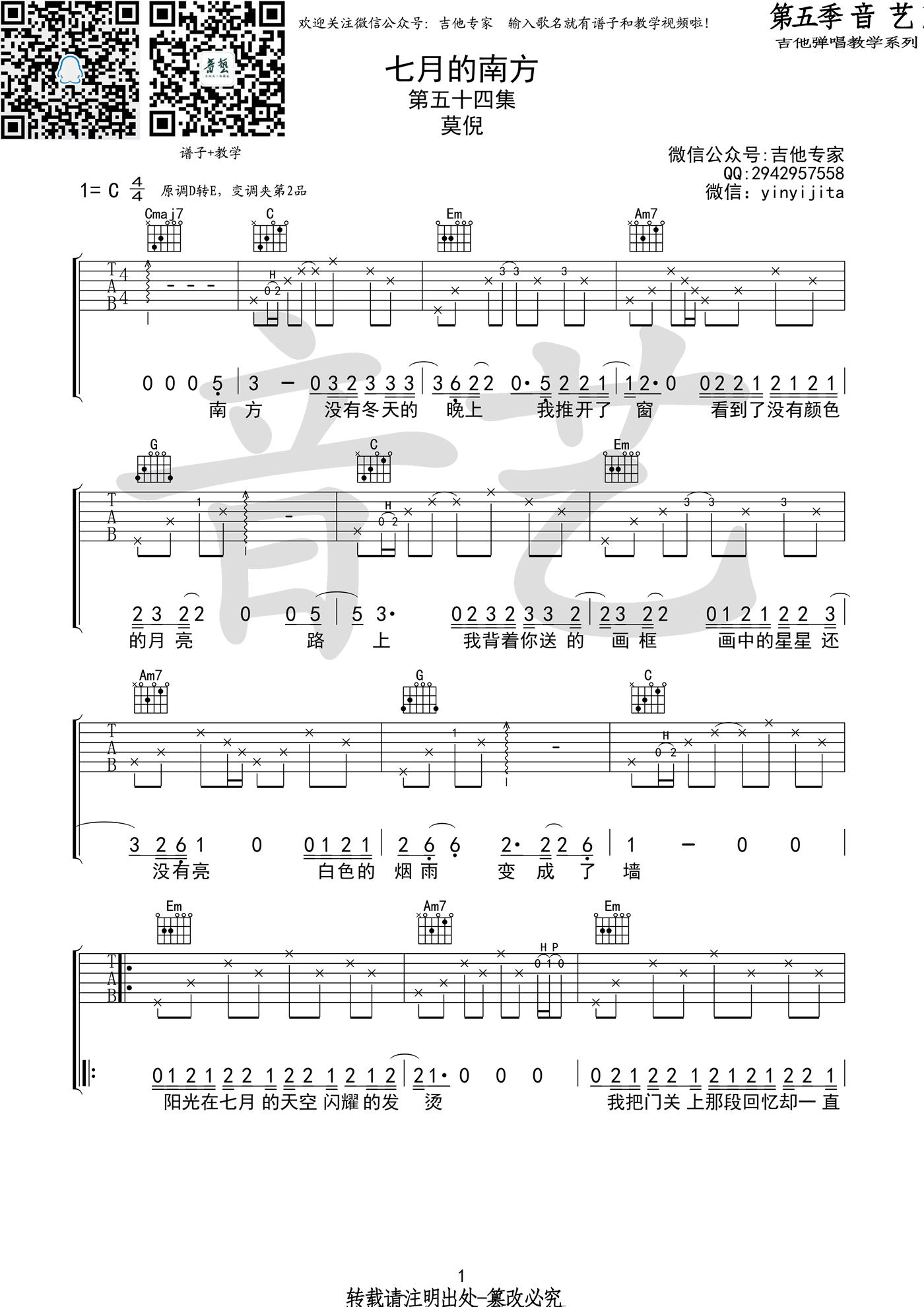 《七月的南方》吉他谱_莫倪_C调弹唱谱六线谱...