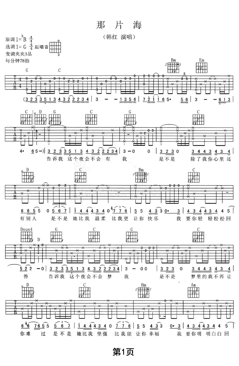 那片海吉他谱_韩红_《那片海》-G调弹唱谱六线谱...