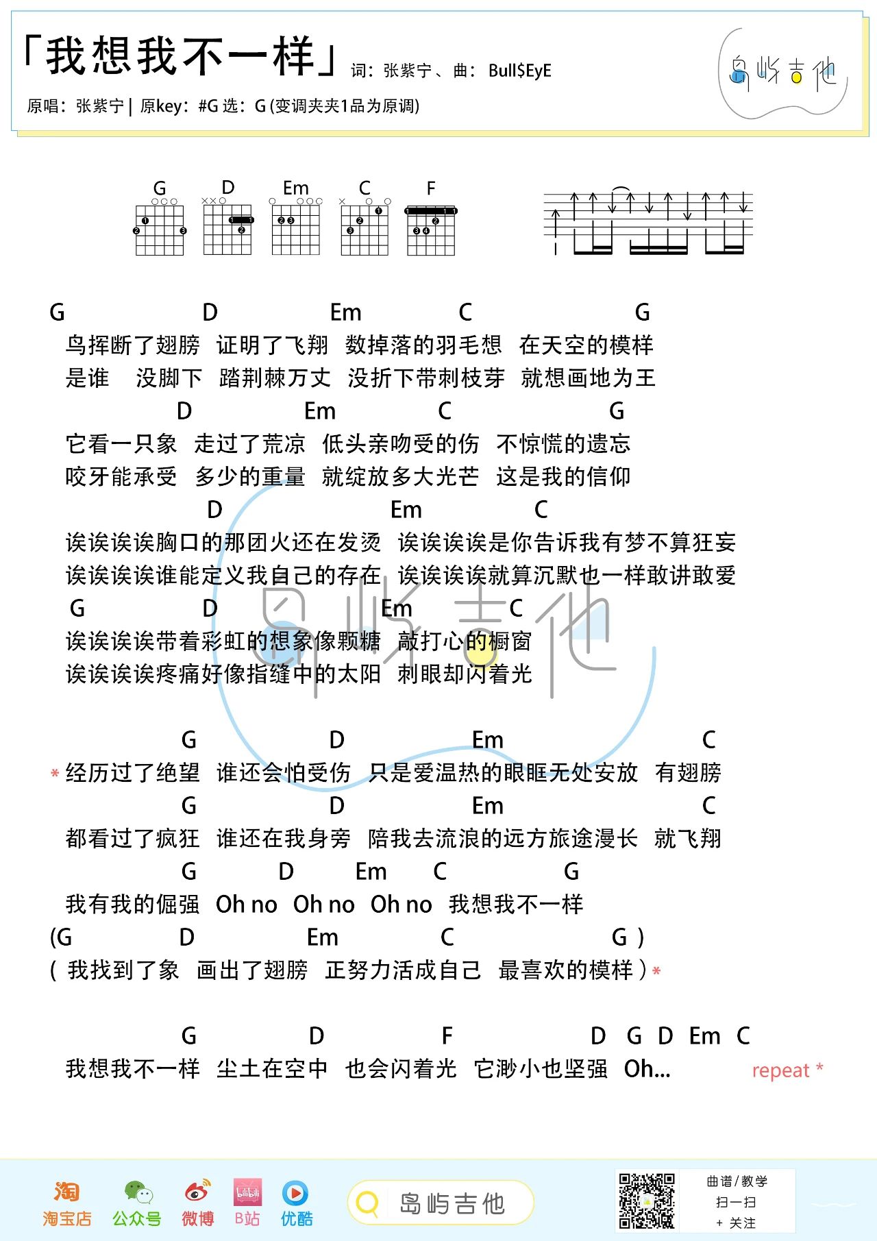 吉他张紫宁《我想我不一样》吉他谱-G调弹唱谱