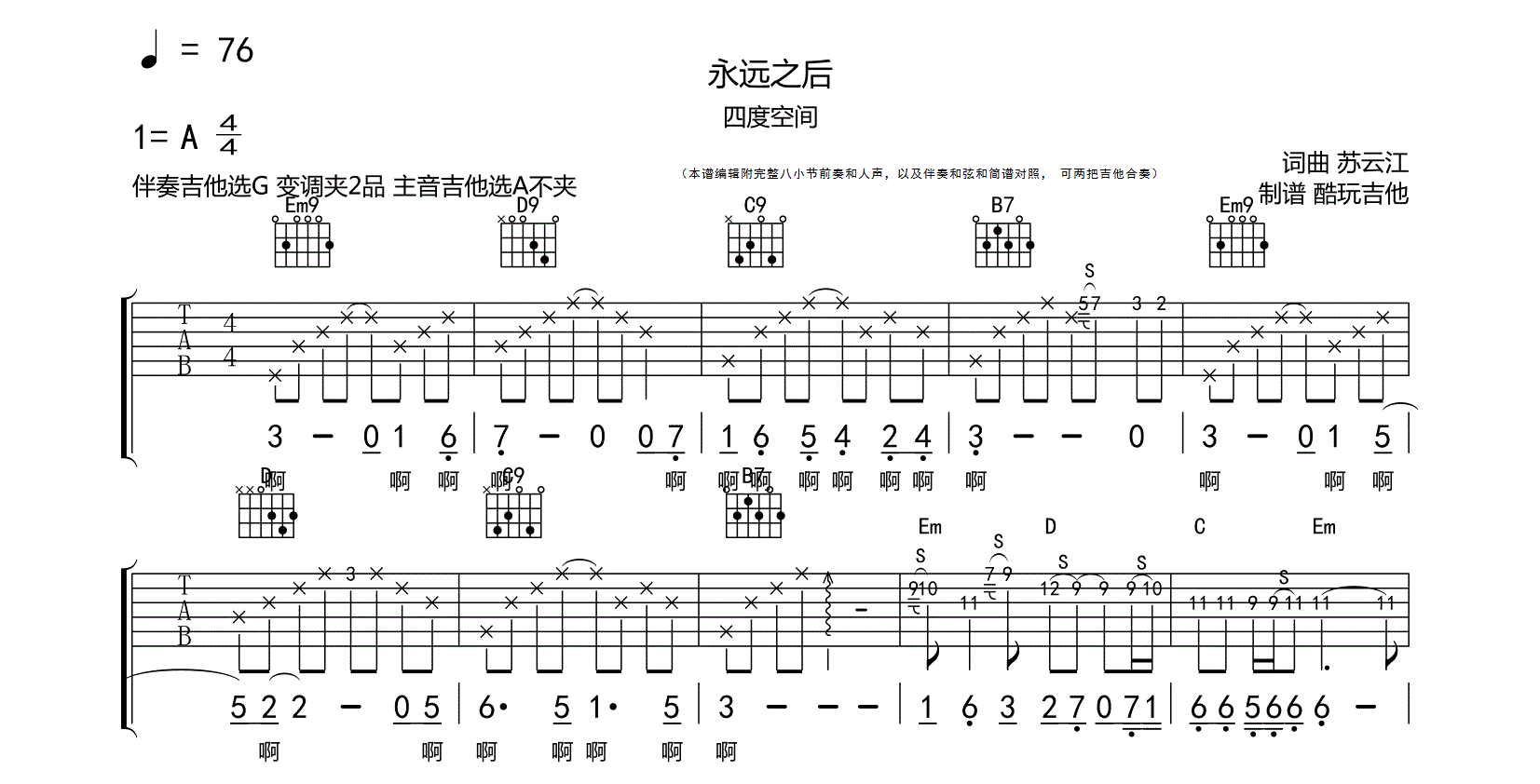 吉他四度空间《永远之后》电吉他谱-简谱对照附和弦-A调完整吉他谱