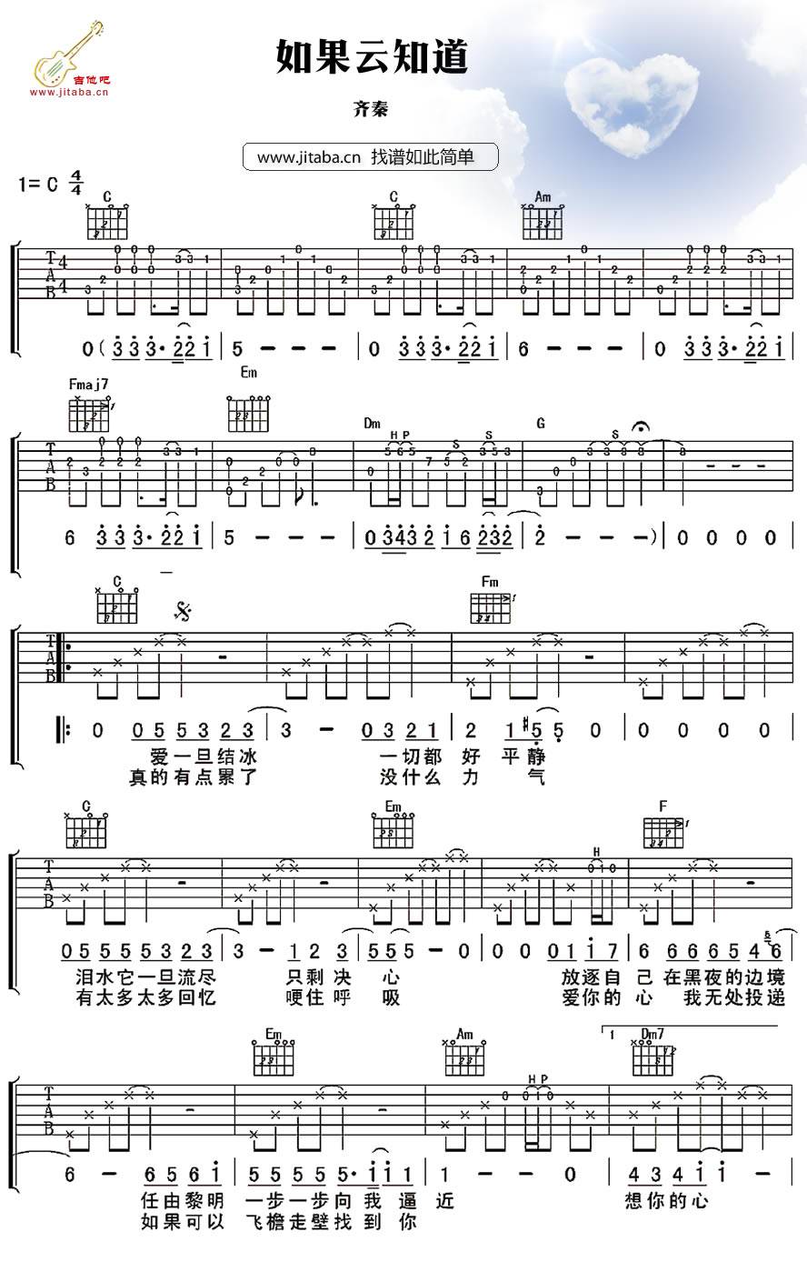 吉他齐秦《如果云知道》吉他谱-C调弹唱谱六线谱
