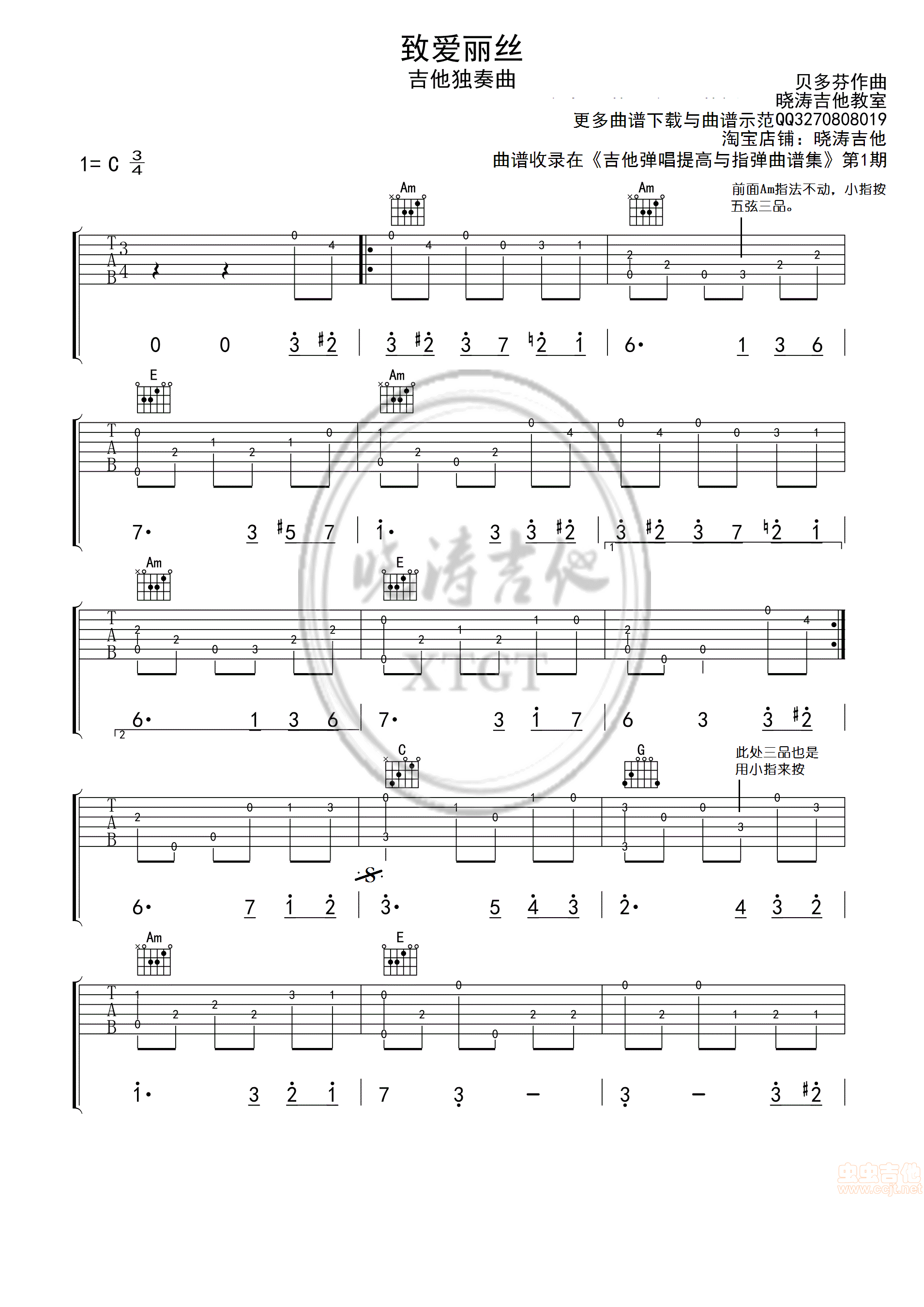 吉他贝多芬《致爱丽丝》吉他谱-C调六线谱