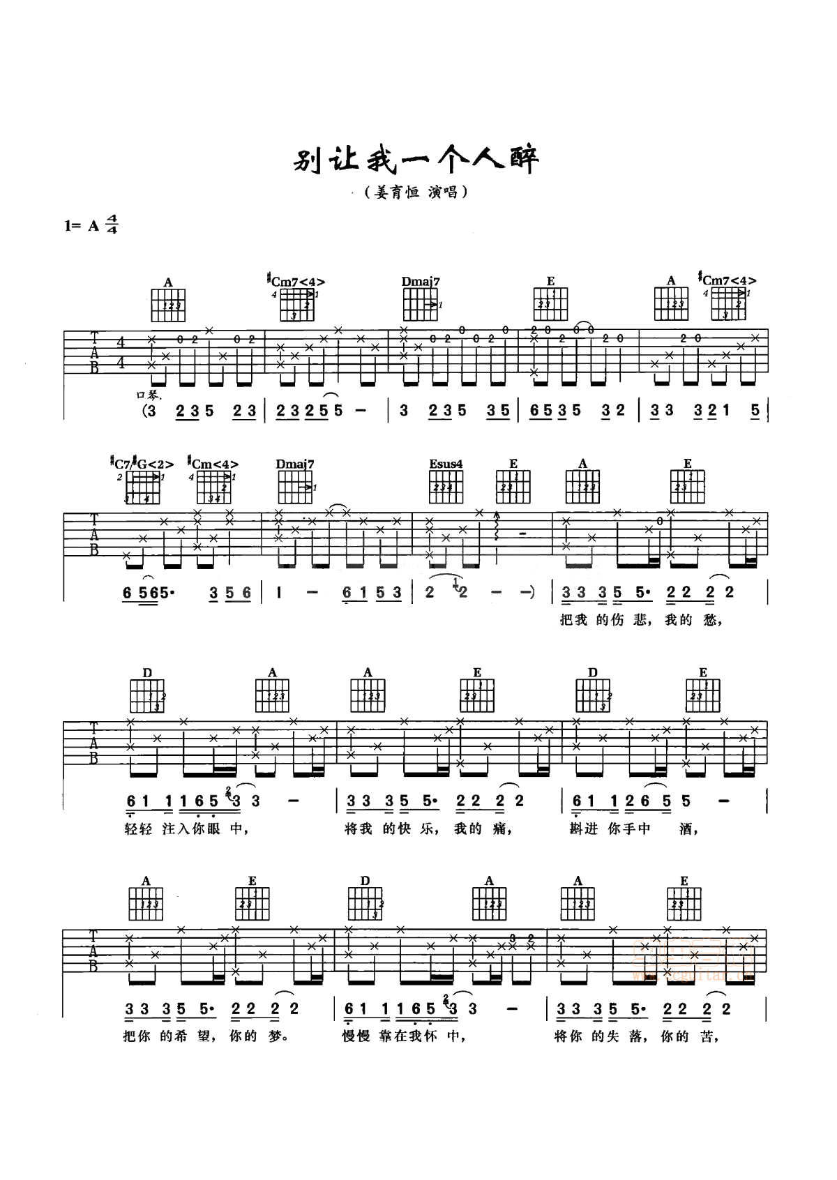 吉他姜育恒《别让我一个人醉》吉他谱-A调弹唱谱六线谱