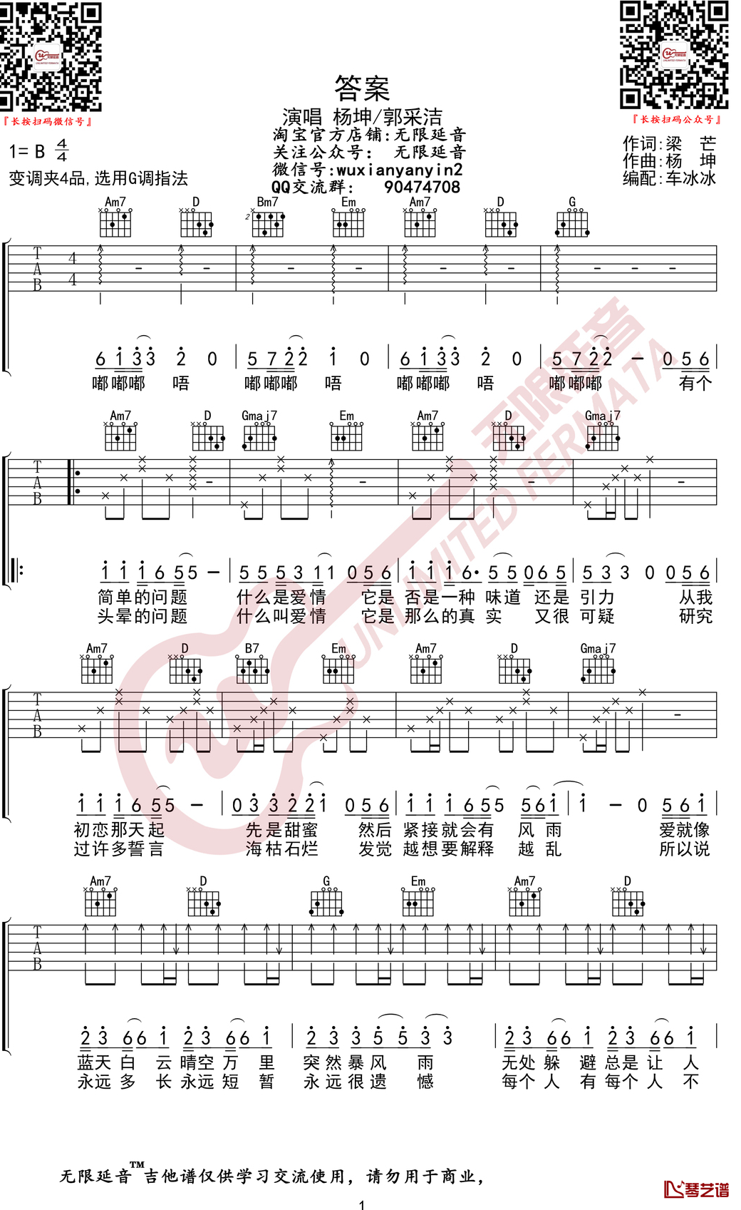 吉他答案吉他谱 杨坤/郭采洁 -G调弹唱谱六线谱