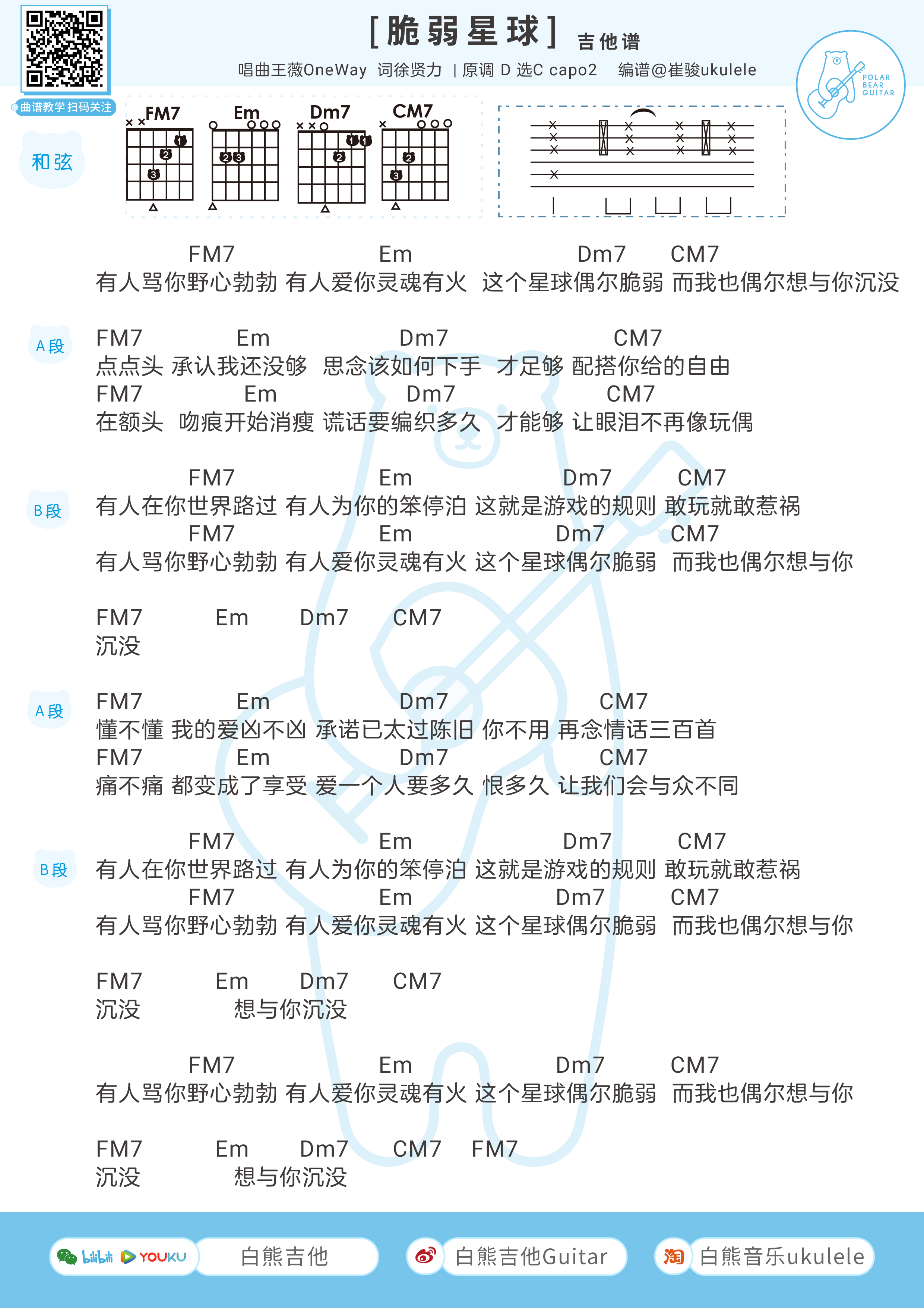 吉他王薇OneWay/杨胖雨《脆弱星球》吉他谱 -C调弹唱谱
