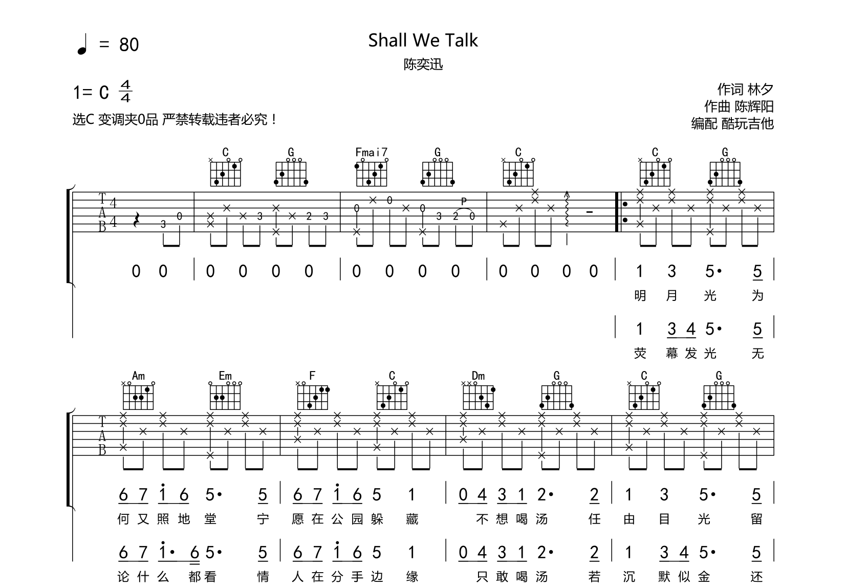 陈奕迅《shallwetalk》吉他谱-最新版-C调吉他弹唱谱此版本为最新版编配完整附带前奏间奏1-2尾奏,前奏为个人主观编配,音频为手机录制,只是录制到间奏以作示范试听...