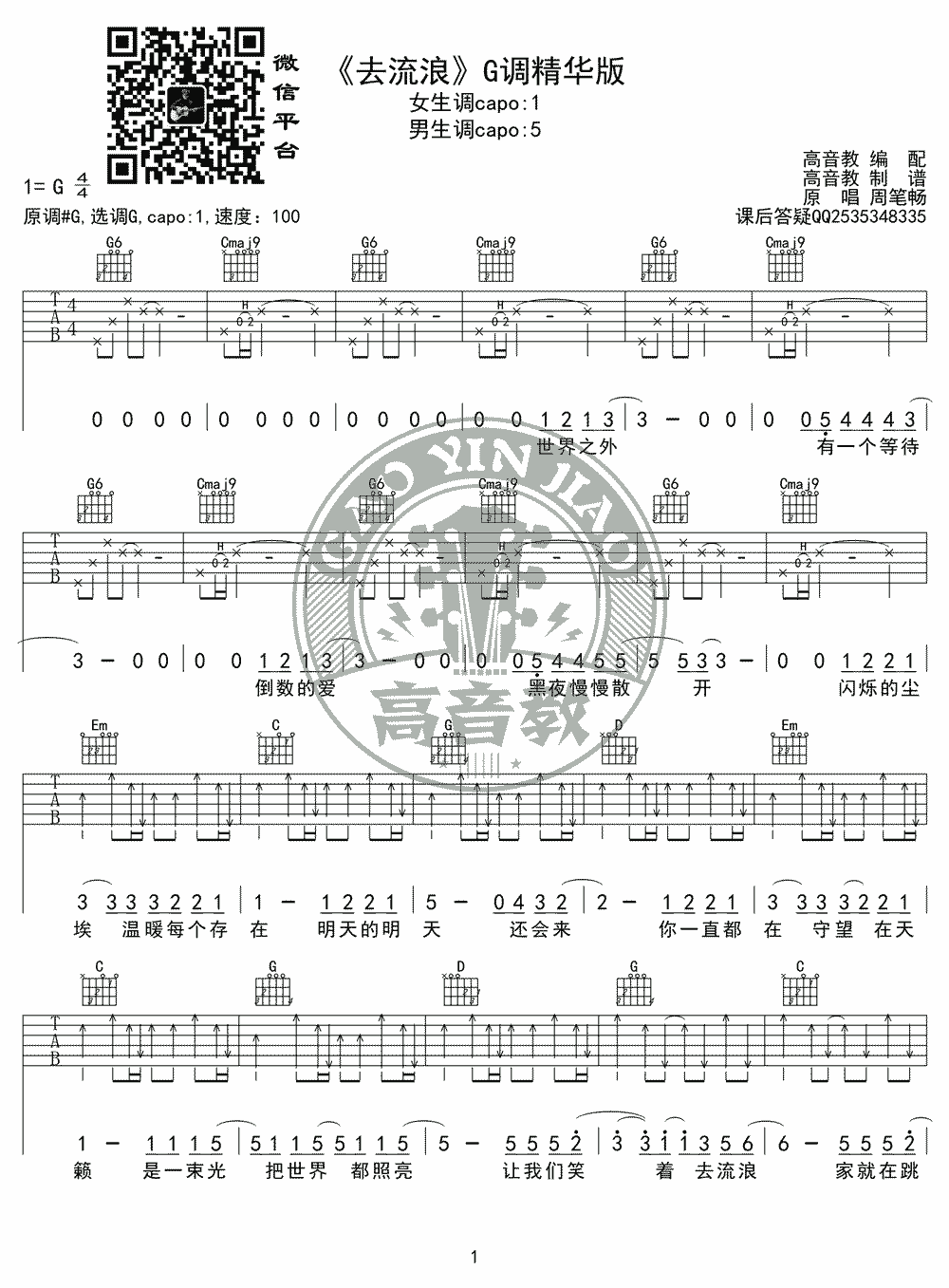 吉他周笔畅《去流浪》吉他谱-G调弹唱谱六线谱