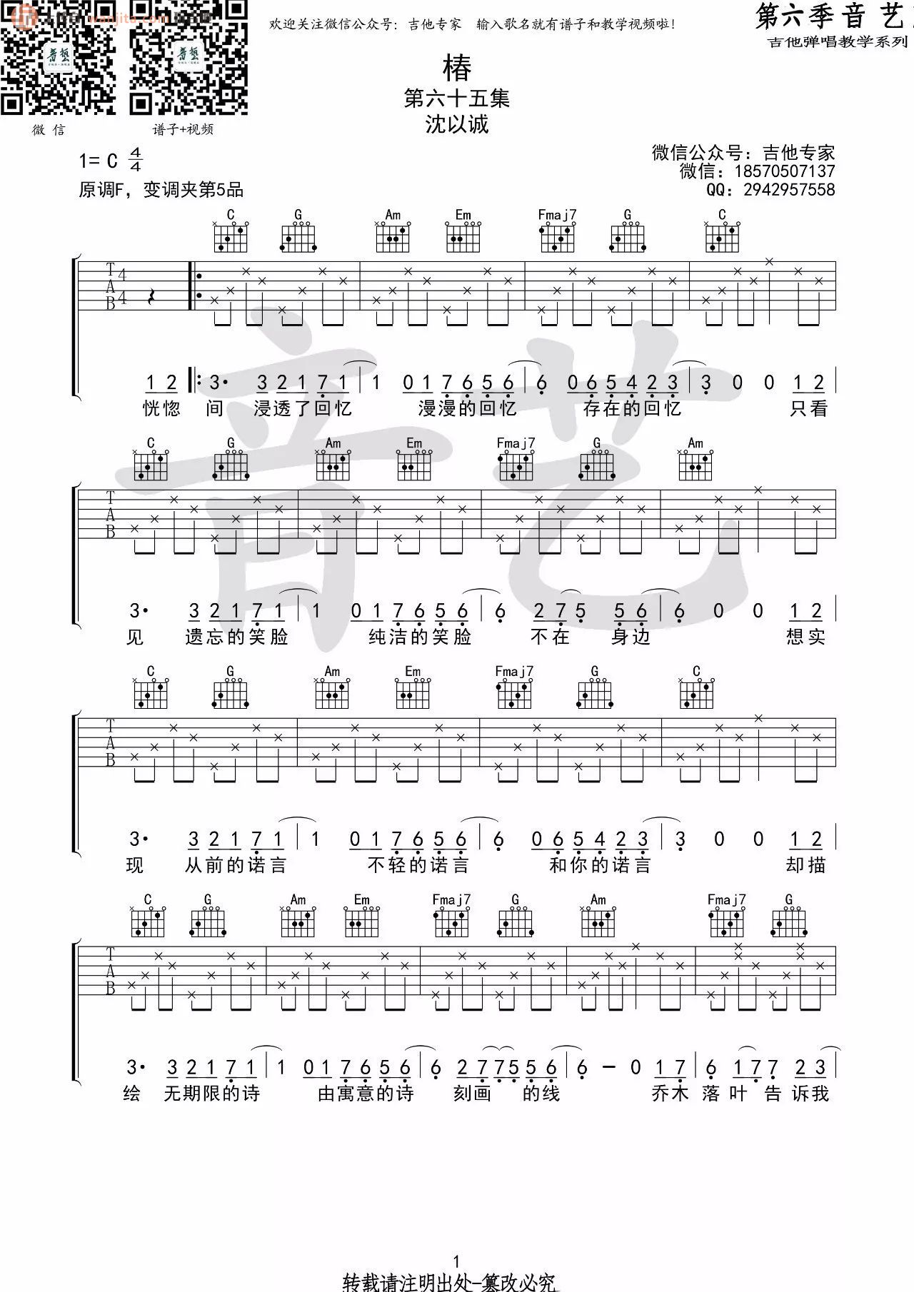 沈以诚-《椿》吉他谱-C调弹唱谱六线谱...