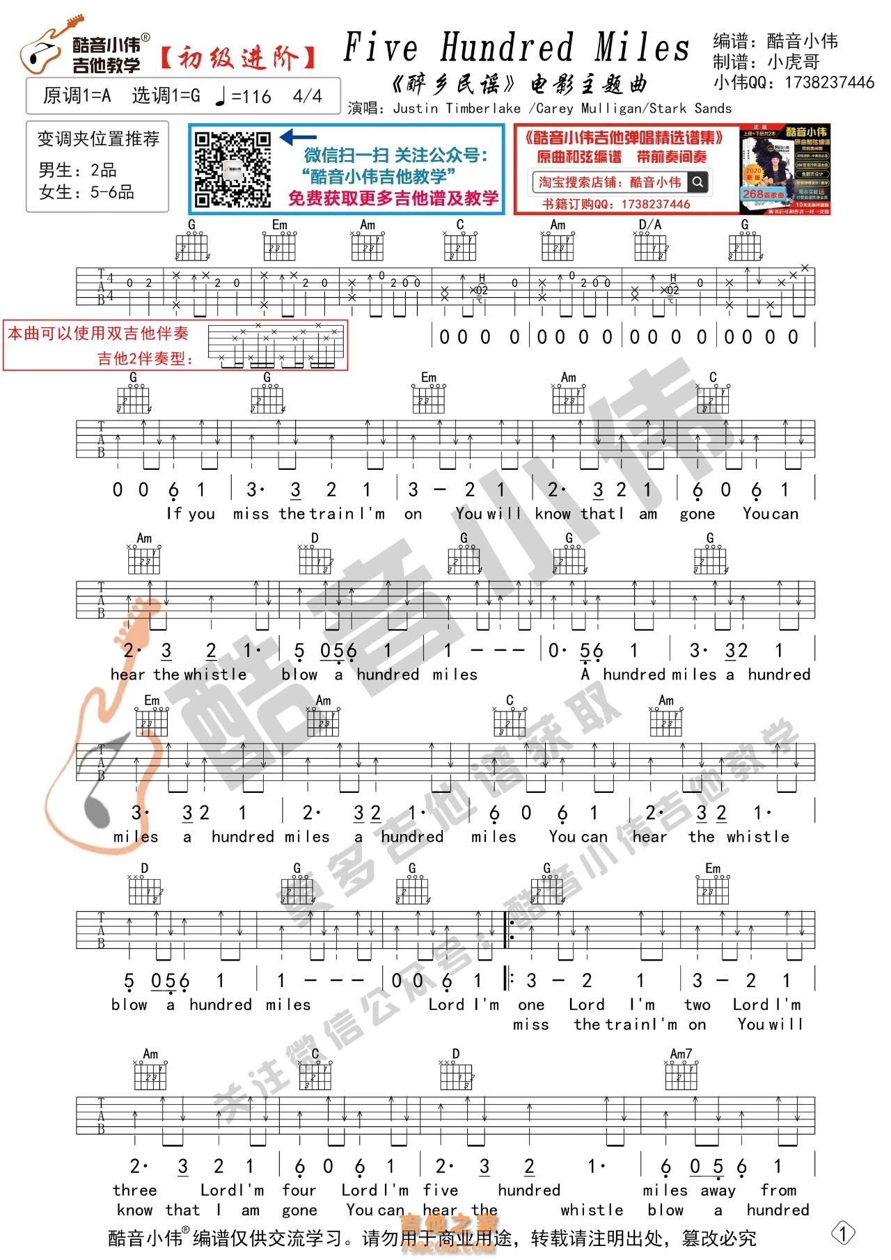 民谣《FiveHundredMiles》500里吉他谱-G调弹唱谱六线谱...