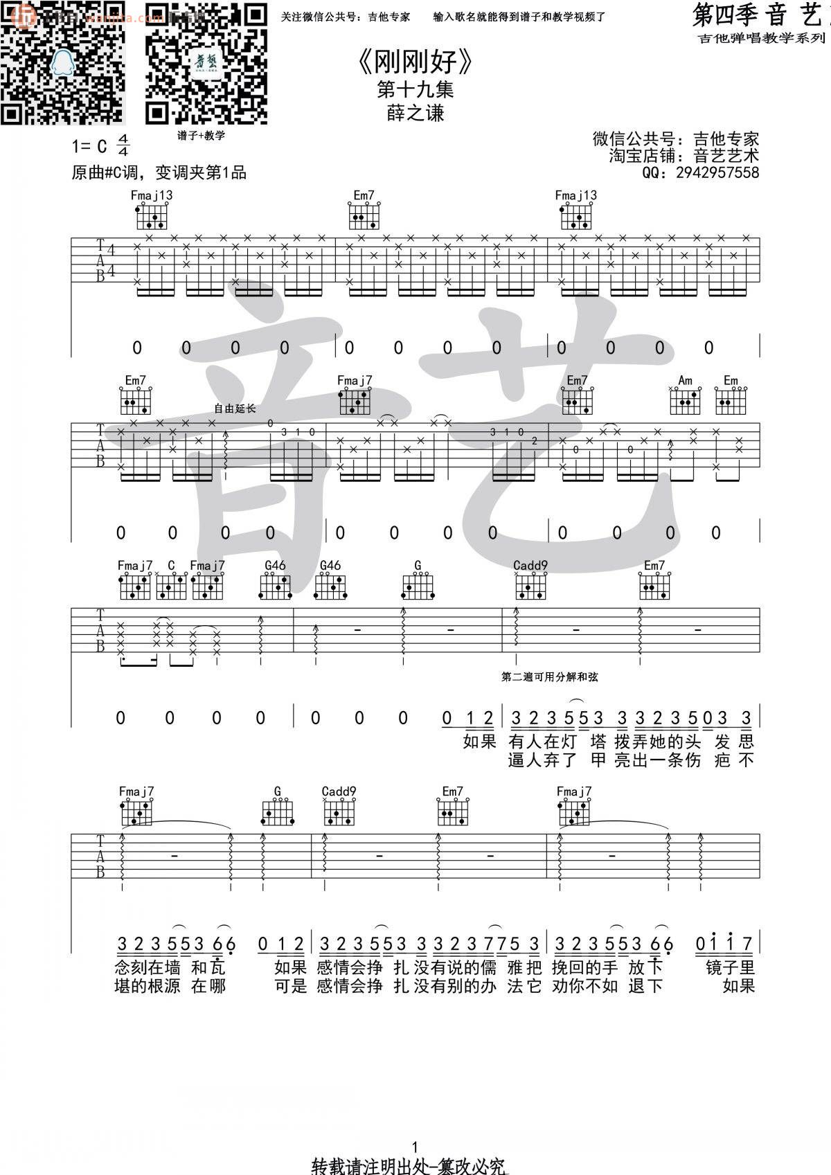 薛之谦《刚刚好》吉他谱-C调弹唱谱六线谱...