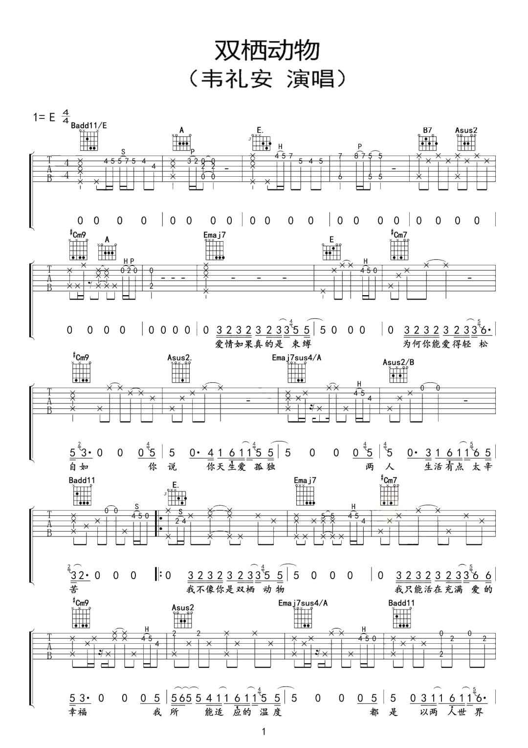 吉他《双栖动物》吉他谱_韦礼安/蔡健雅_E调原版弹唱谱六线谱