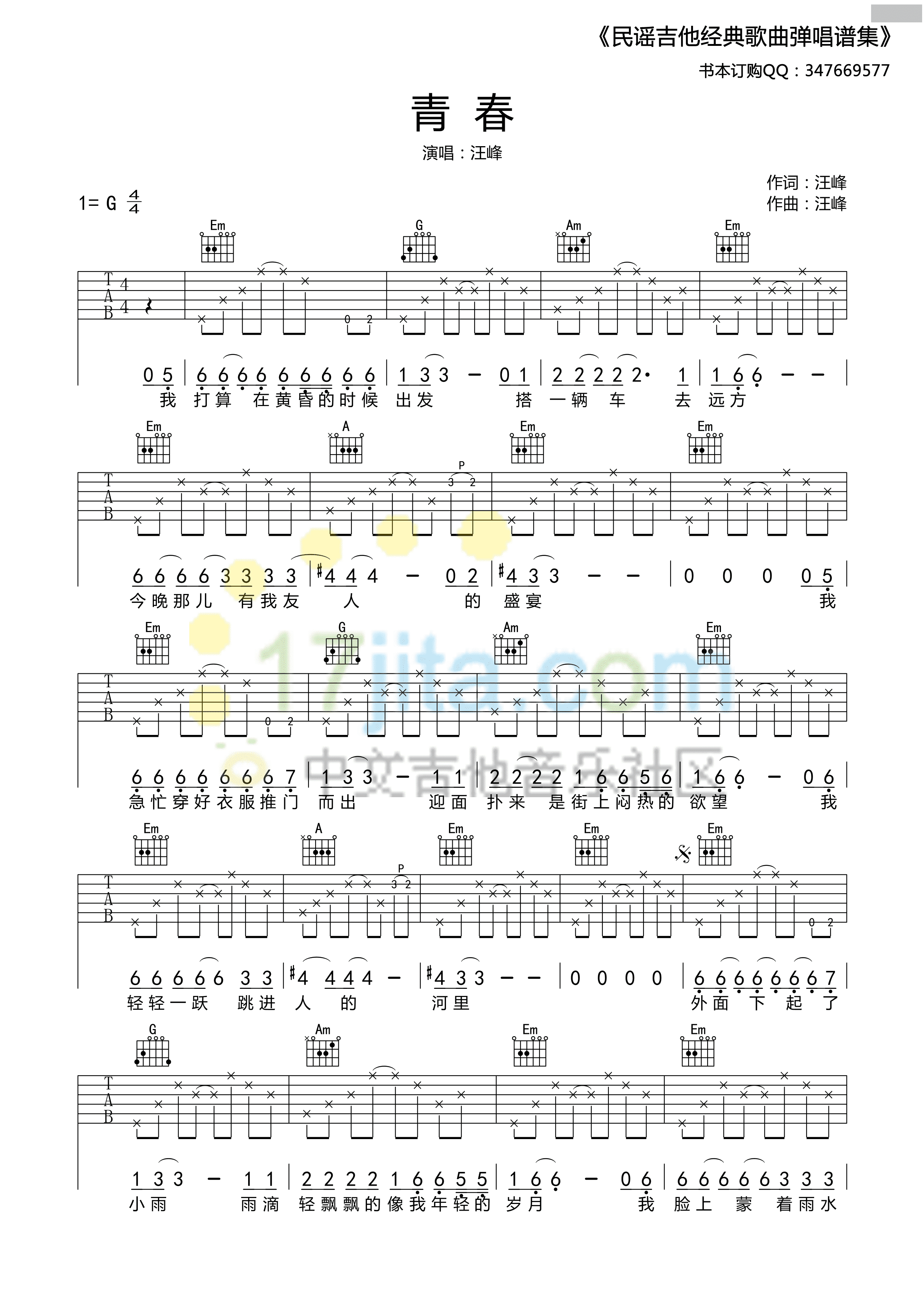 吉他汪峰-青春吉他谱-G调六线谱弹唱谱