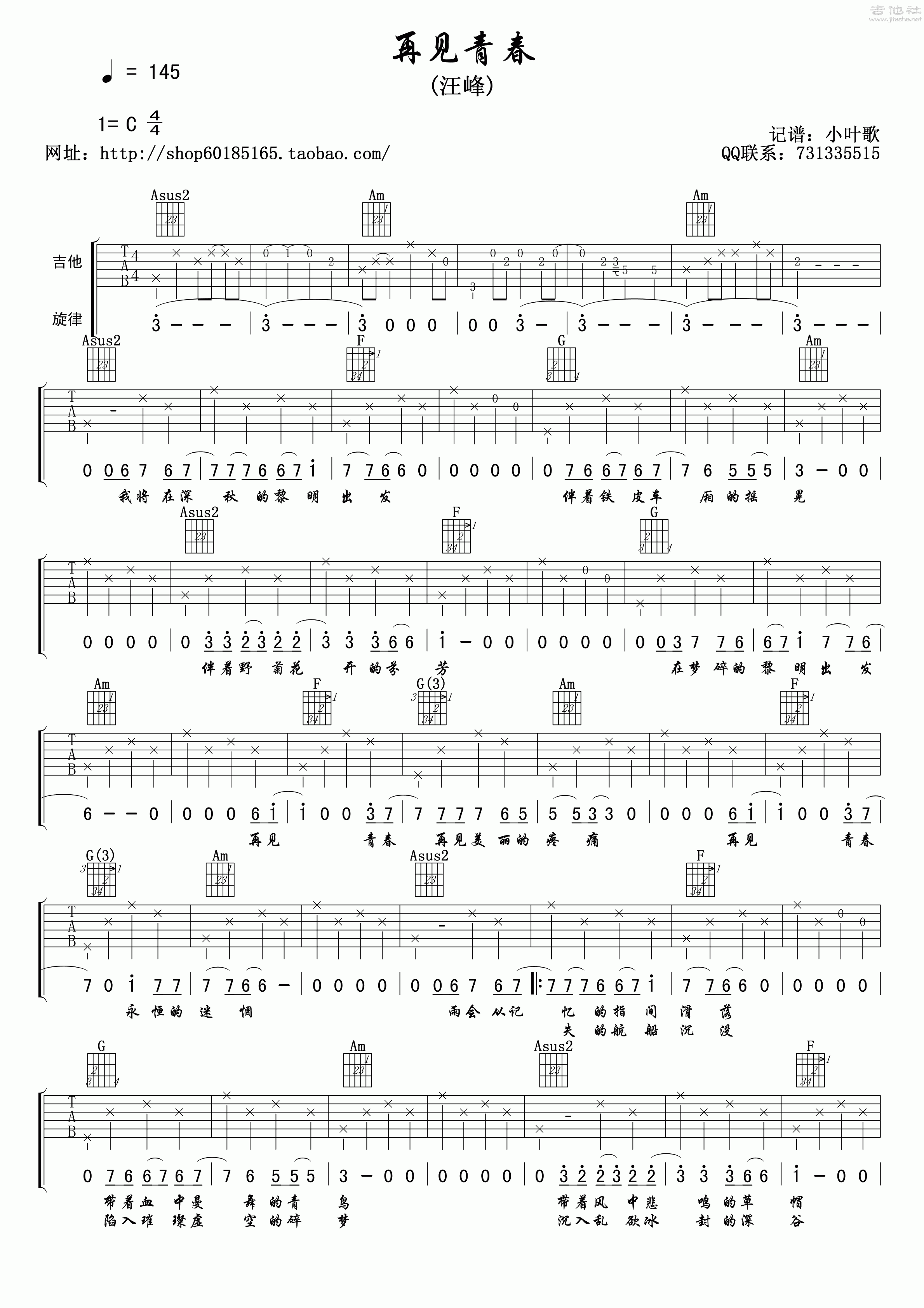 吉他汪峰-再见青春吉他谱-C调六线谱弹唱谱