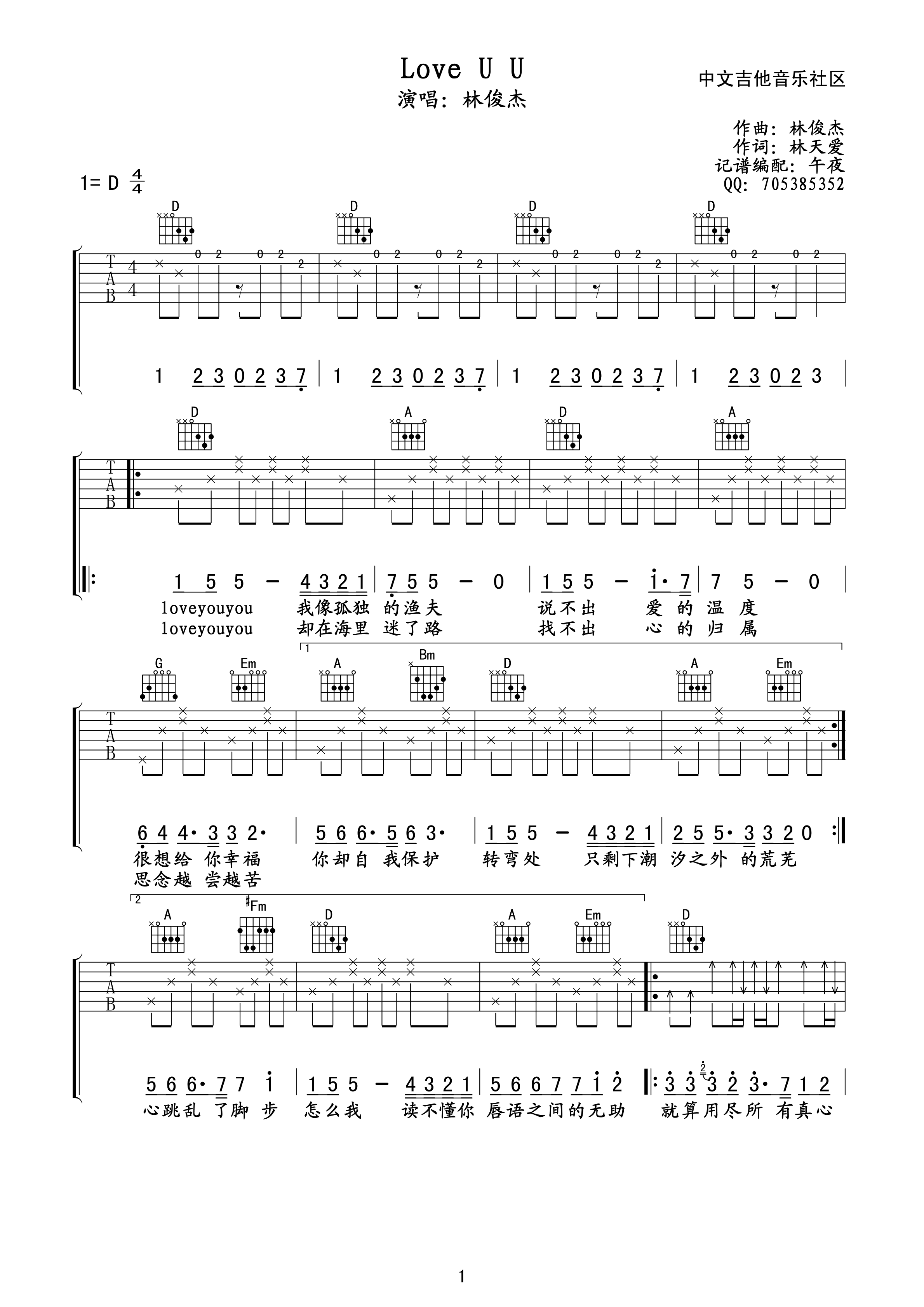 吉他林俊杰-LOVE U U吉他谱-D调六线谱弹唱谱