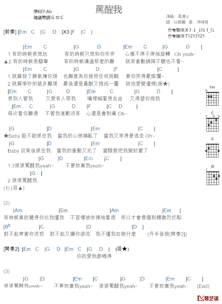 骂醒我吉他谱周汤豪简易版弹唱谱...