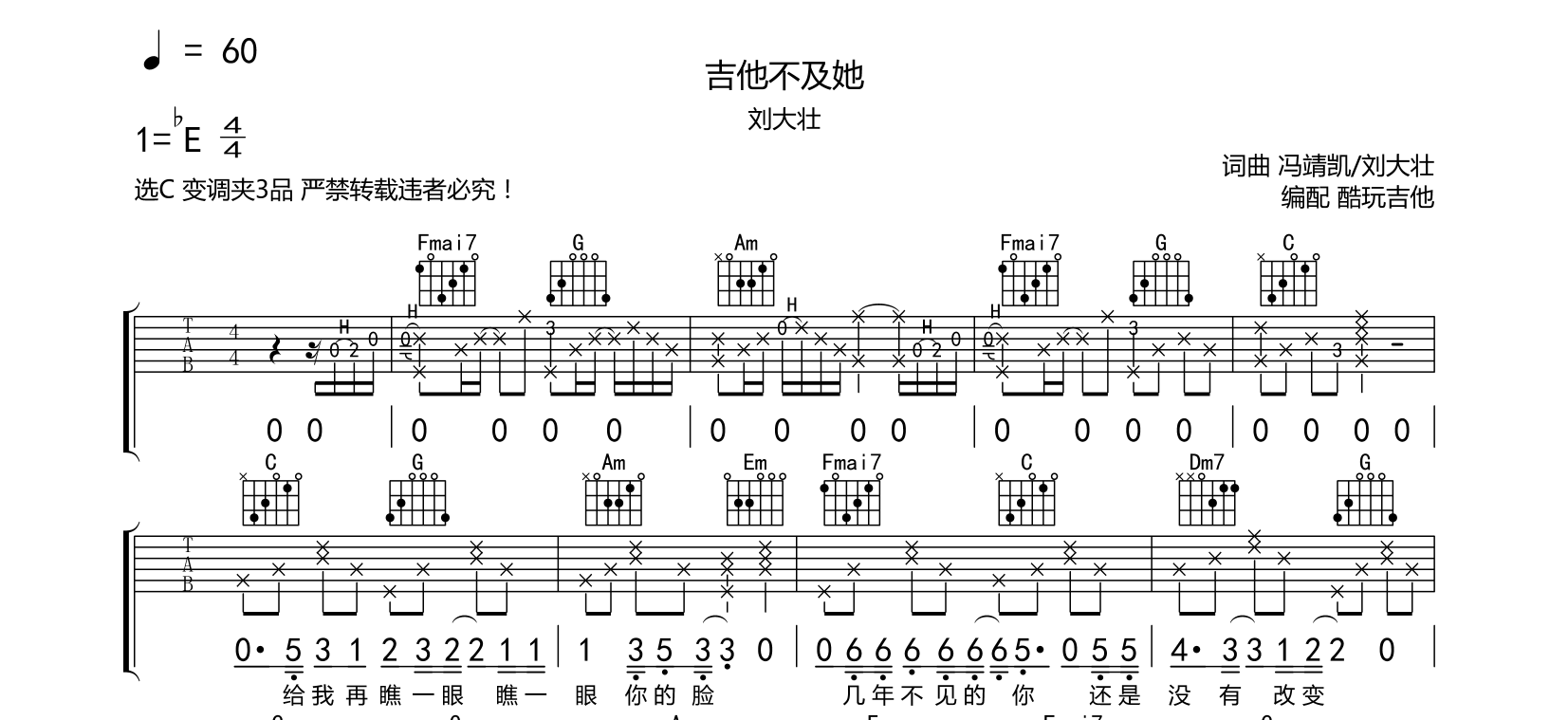 刘大壮《吉他不及她》吉他谱-C调吉他弹唱谱选C变调夹3品原版效果编配音频为手机录制只是录制了第一遍达到间奏以作做示范抖音热门歌曲...