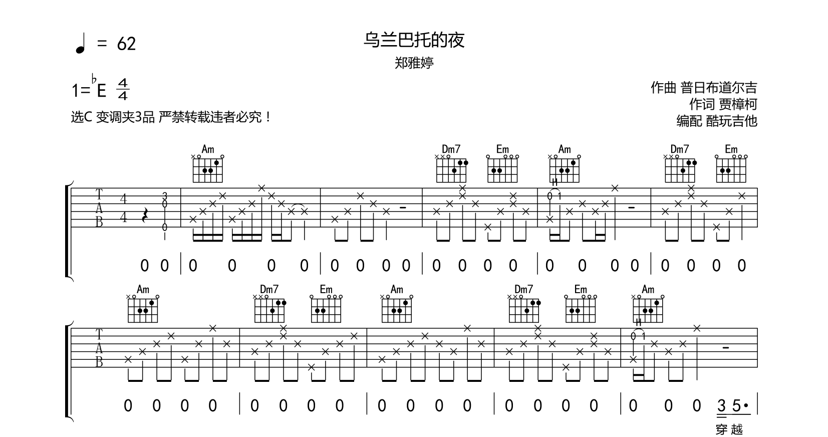 吉他郑雅婷《乌兰巴托的夜》-C调吉他弹唱谱