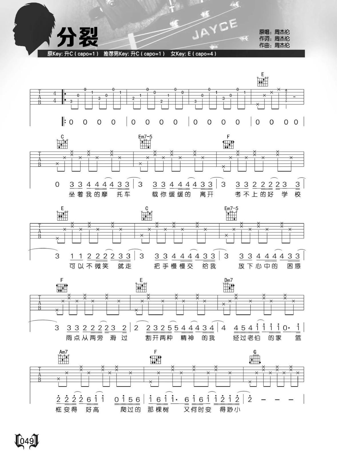 吉他分裂吉他谱_周杰伦_《分裂》C调弹唱谱六线谱