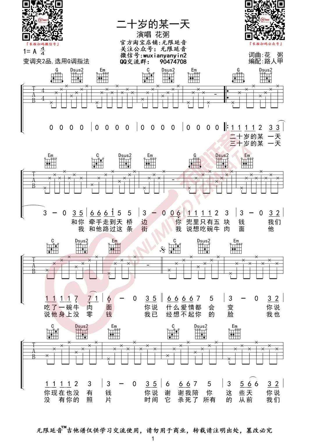 吉他《二十岁的某一天》吉他谱_花粥_G调原版弹唱谱六线谱