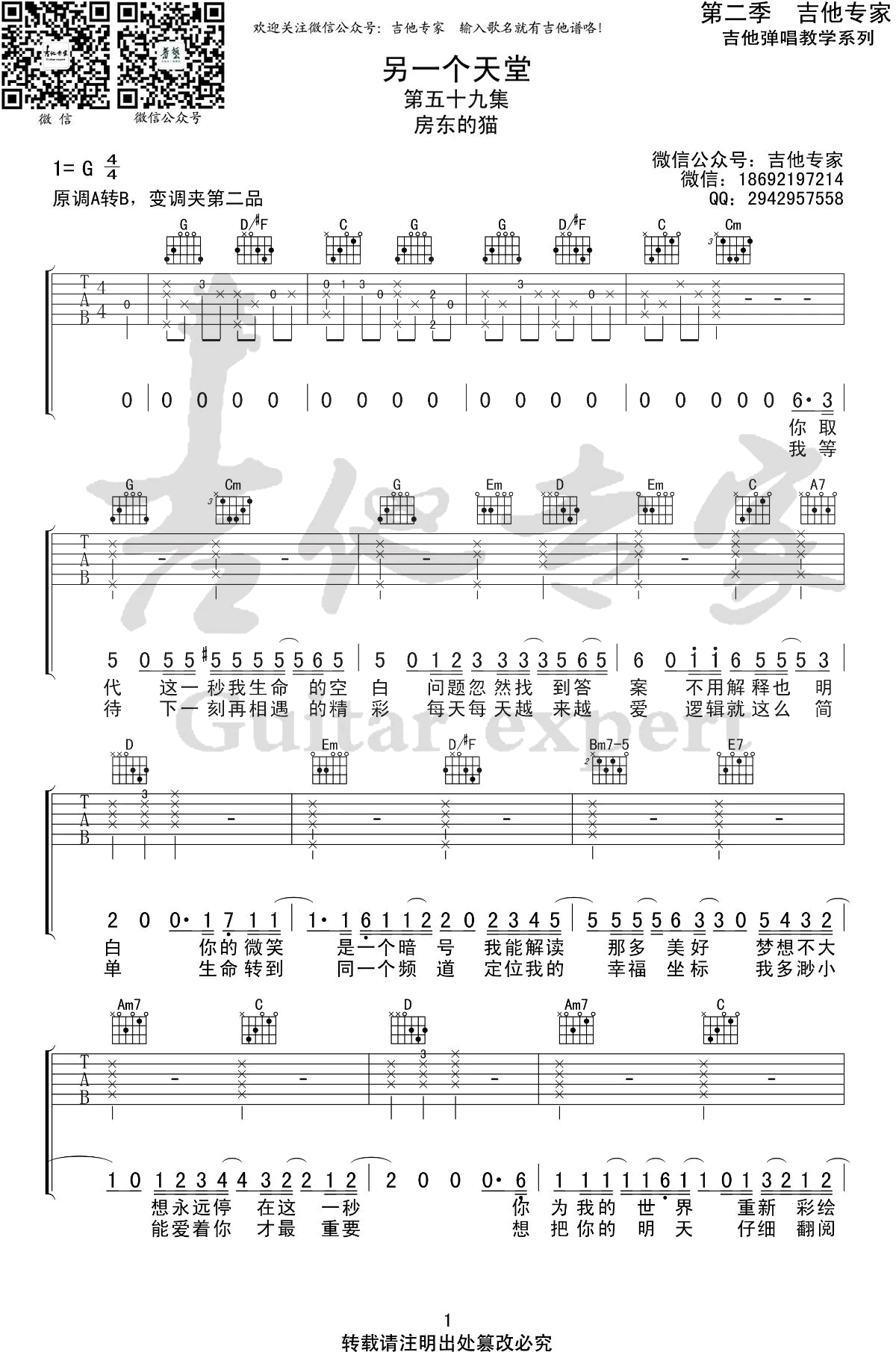 吉他《另一个天堂》吉他谱_房东的猫_G调弹唱谱六线谱