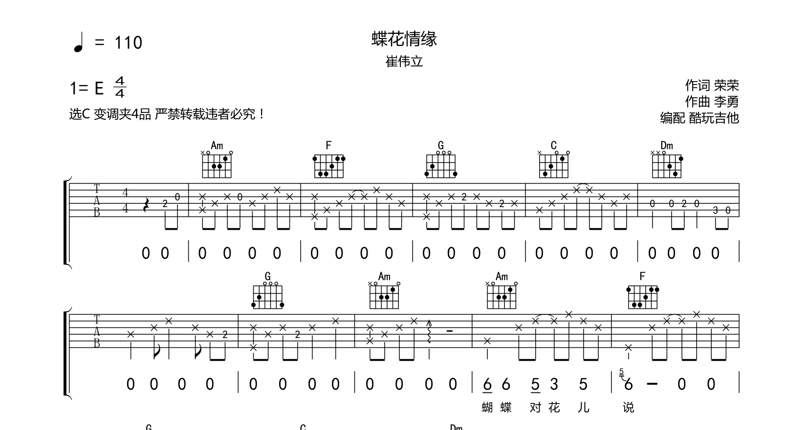 蝶花情缘吉他谱-崔伟立-C调六线谱弹唱谱选C变调夹4品附带完整前奏间奏尾奏音频为手机录制只是录制了第一遍到结束以作示范歌曲比较简单适合初学者...