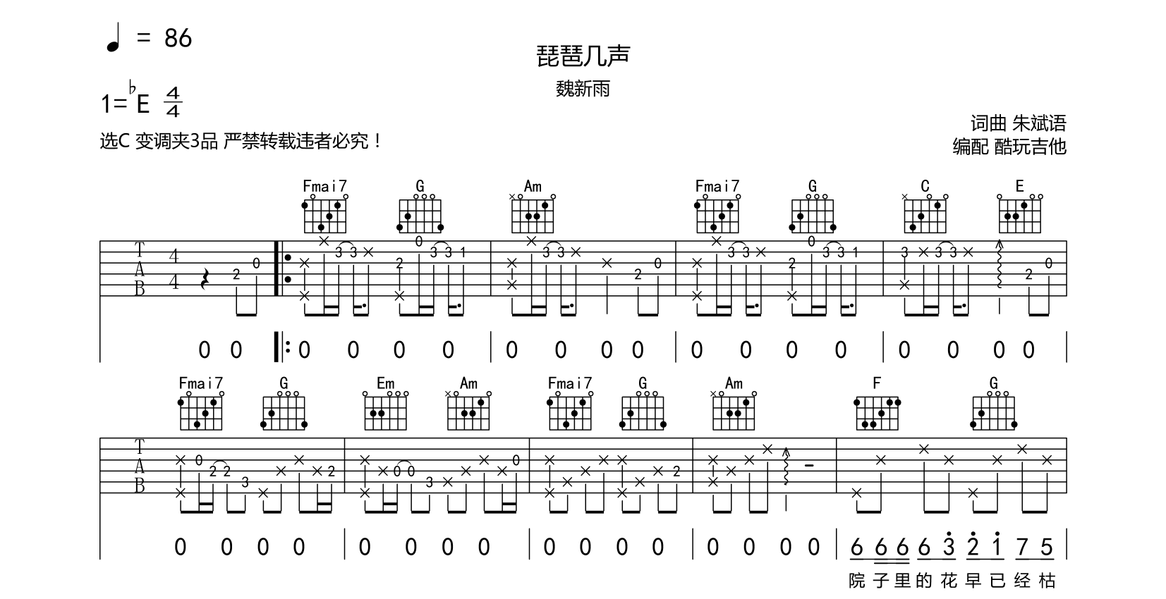 琵琶几声吉他谱-魏新雨-C调六线谱弹唱谱首发选C变调夹3品附带完整前奏间奏尾奏音频为手机录制只是录制了第一遍以作示范...