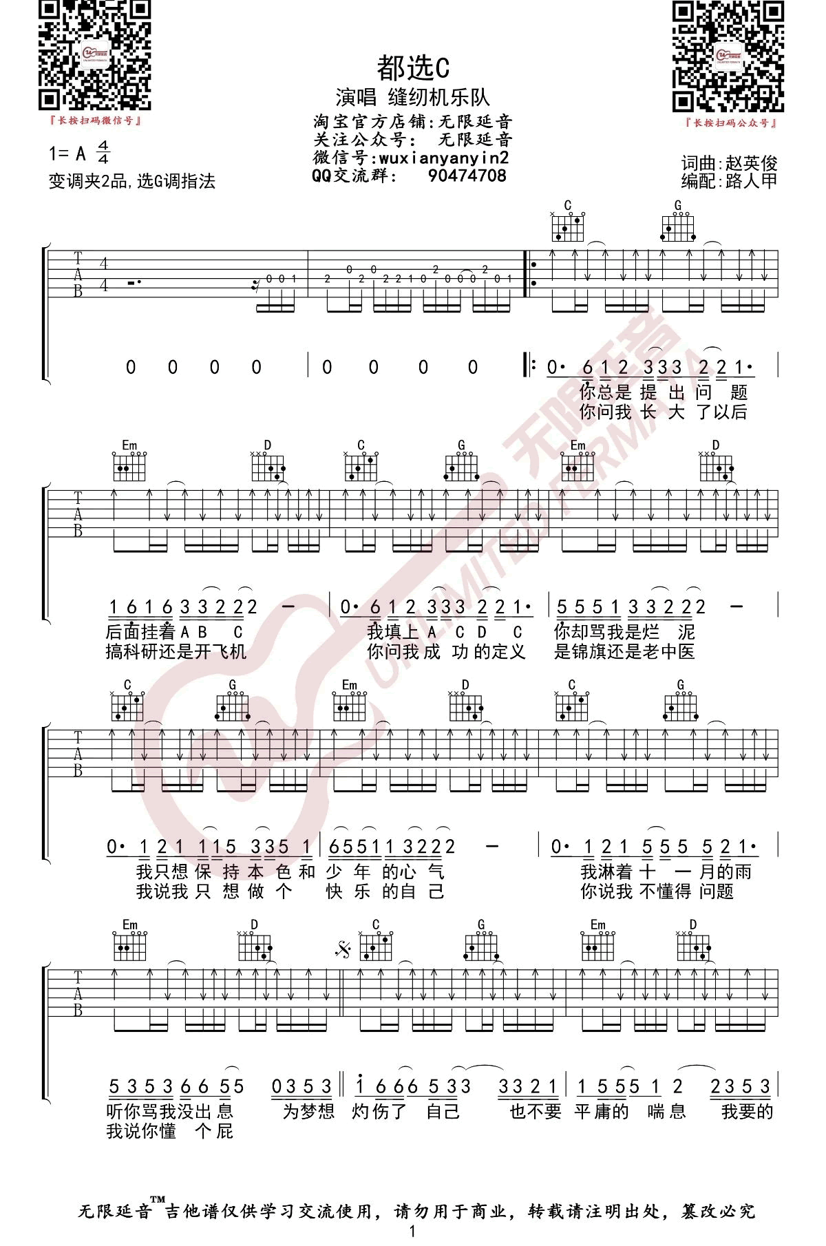 都选C吉他谱_缝纫机乐队_《都选C》G调弹唱谱六线谱...