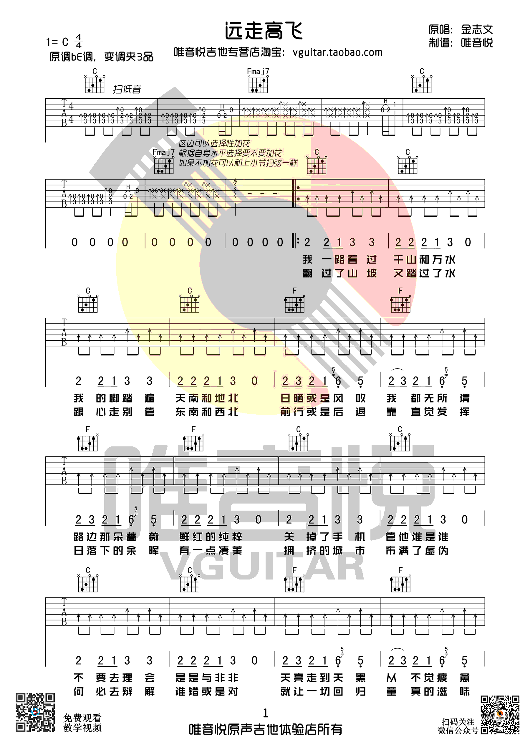 吉他《远走高飞》吉他谱_金志文_C调简单版弹唱谱六线谱