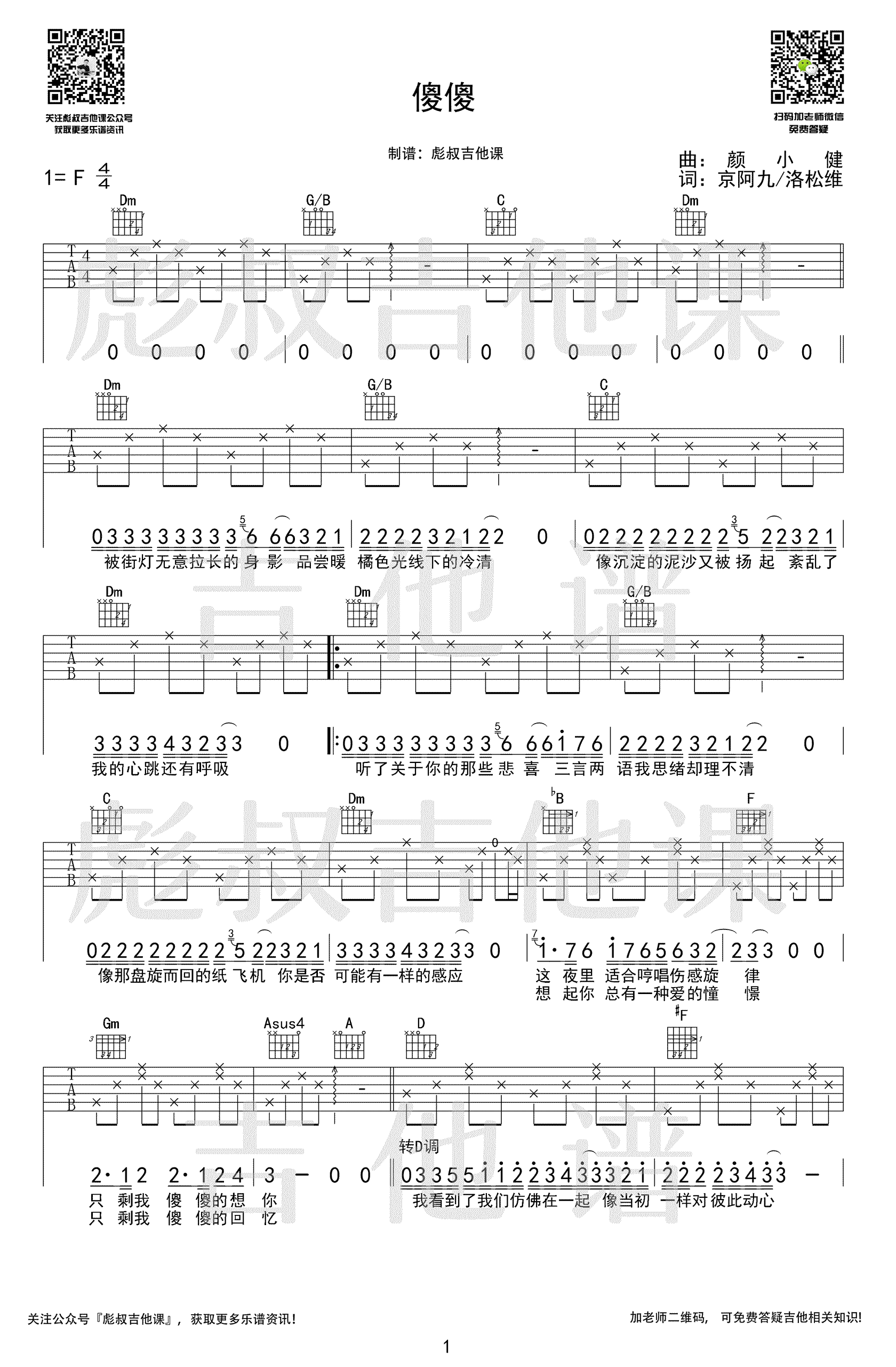 傻傻吉他谱_Uu_《傻傻》_C调弹唱谱六线谱...