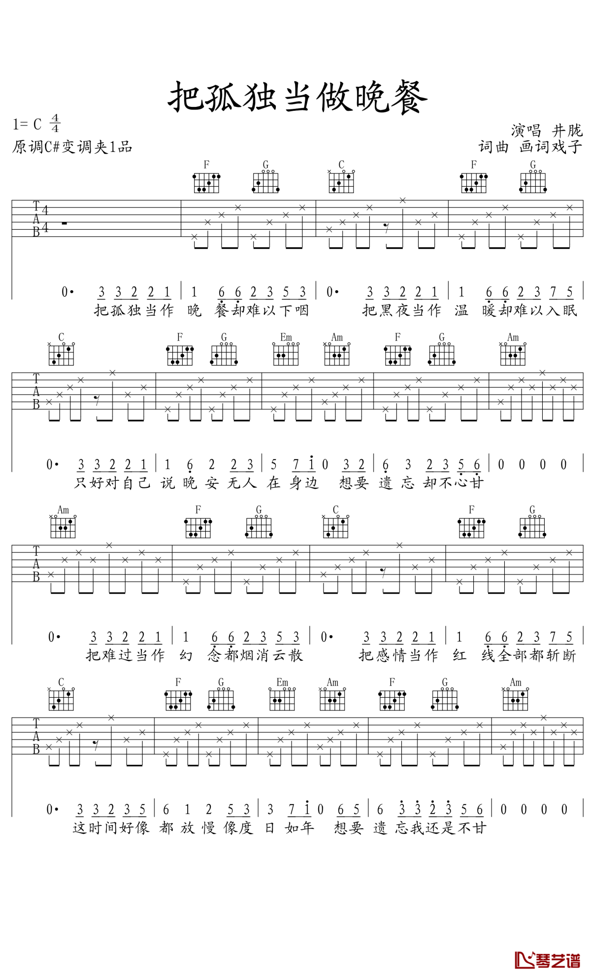 把孤独当做晚餐吉他谱-井胧版本-C调六线谱吉他谱...