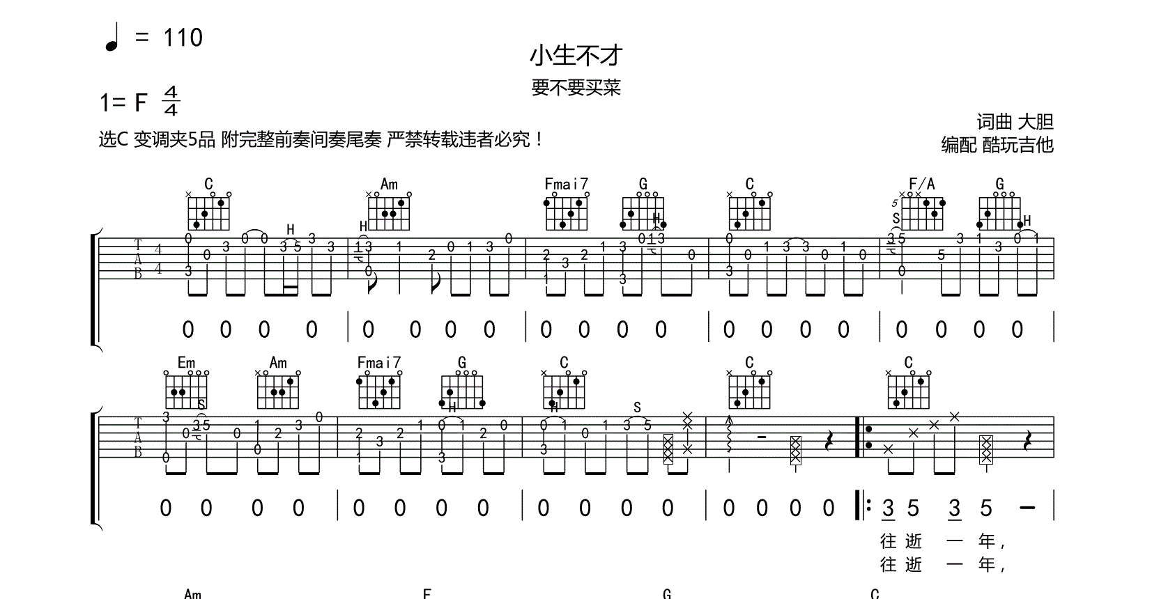 小生不才吉他谱-要不要买菜-C调六线谱弹唱谱亚UN版夏鸥够编配弹唱部分稍作一点简化便于弹唱节奏基本一致附带完整前奏间奏尾奏选C变调夹5品音频为手机录制只是录制了难点部分即前奏间奏尾奏歌曲弹唱也相对快一点需要熟练以后再加入唱的部分...
