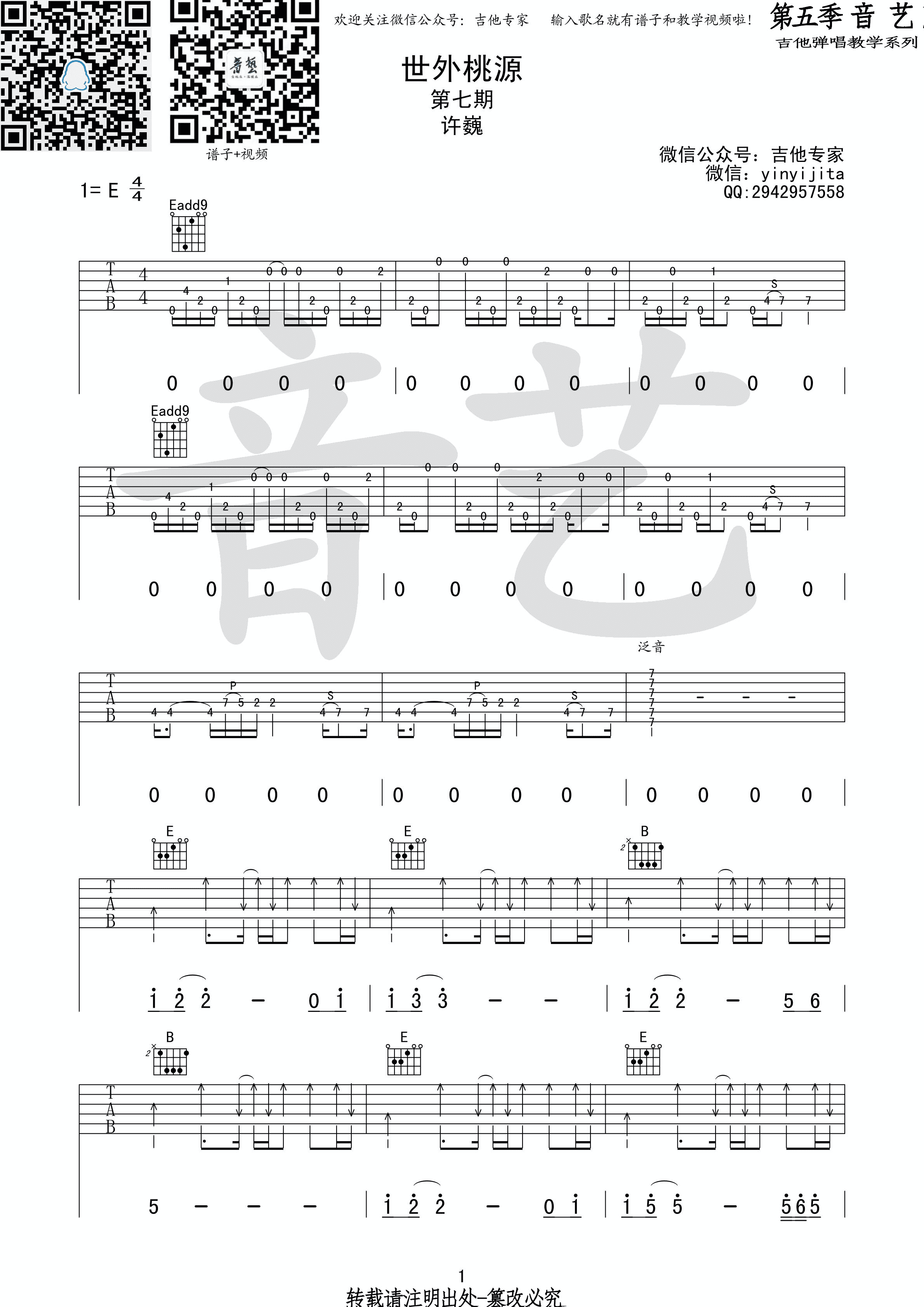 吉他 世外桃源吉他谱-许巍 -E调六线谱弹唱谱