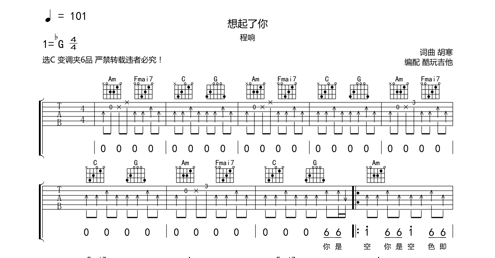 吉他想起了你吉他谱-程响-C调六线谱弹唱谱