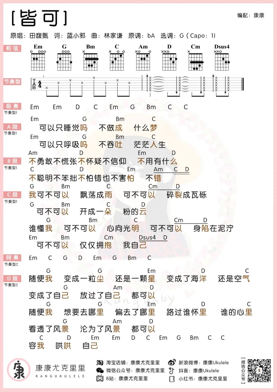 吉他田馥甄-《皆可》-吉他谱- G调弹唱谱和弦谱