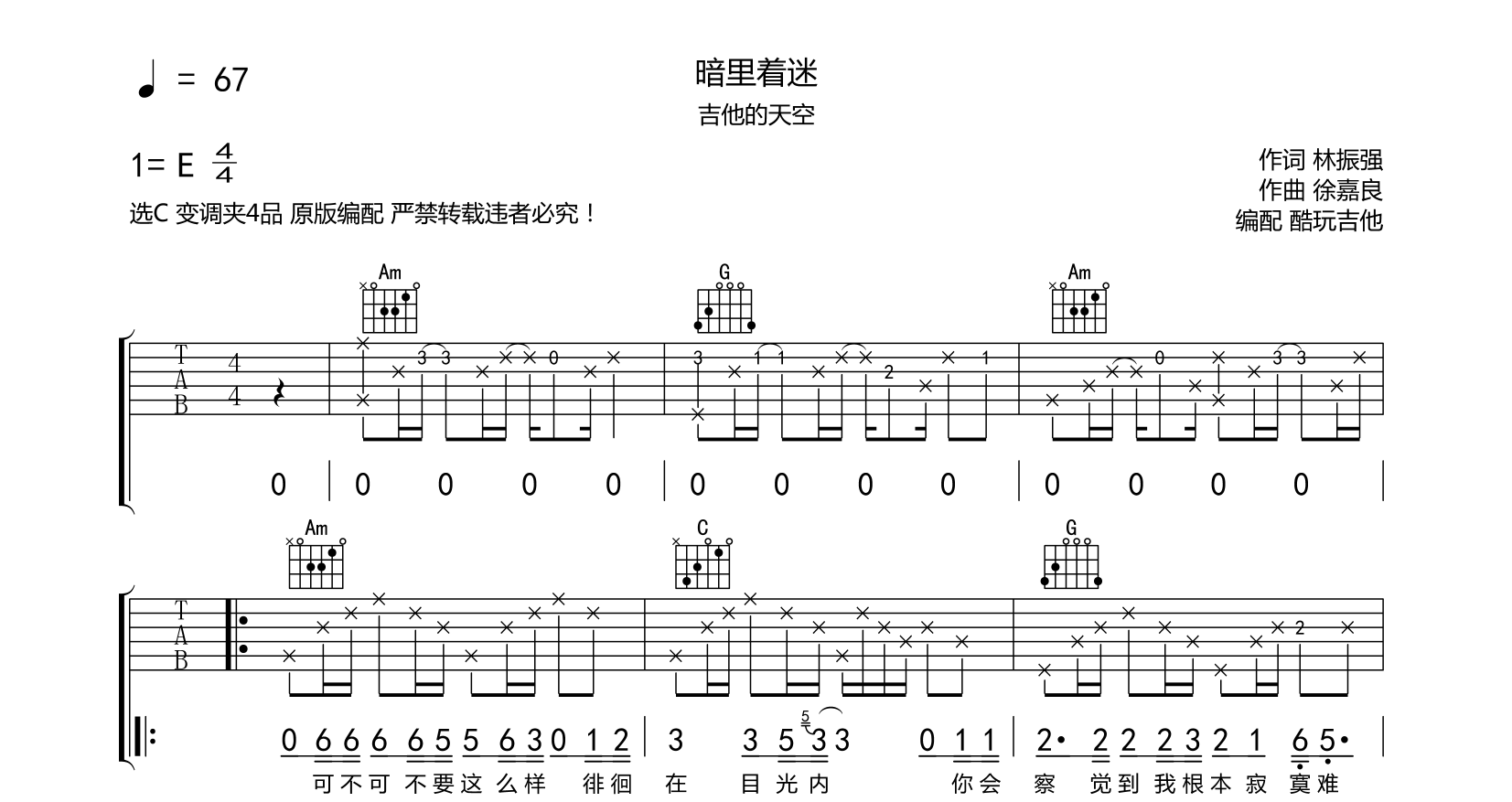 暗里着迷吉他谱-吉他的天空版本-c调六线谱弹唱谱原版编配非常原版效果编配且相对简单附带完整前奏间奏尾奏音频为手机录制只是录制了第一遍到间奏结束以作示范试听...