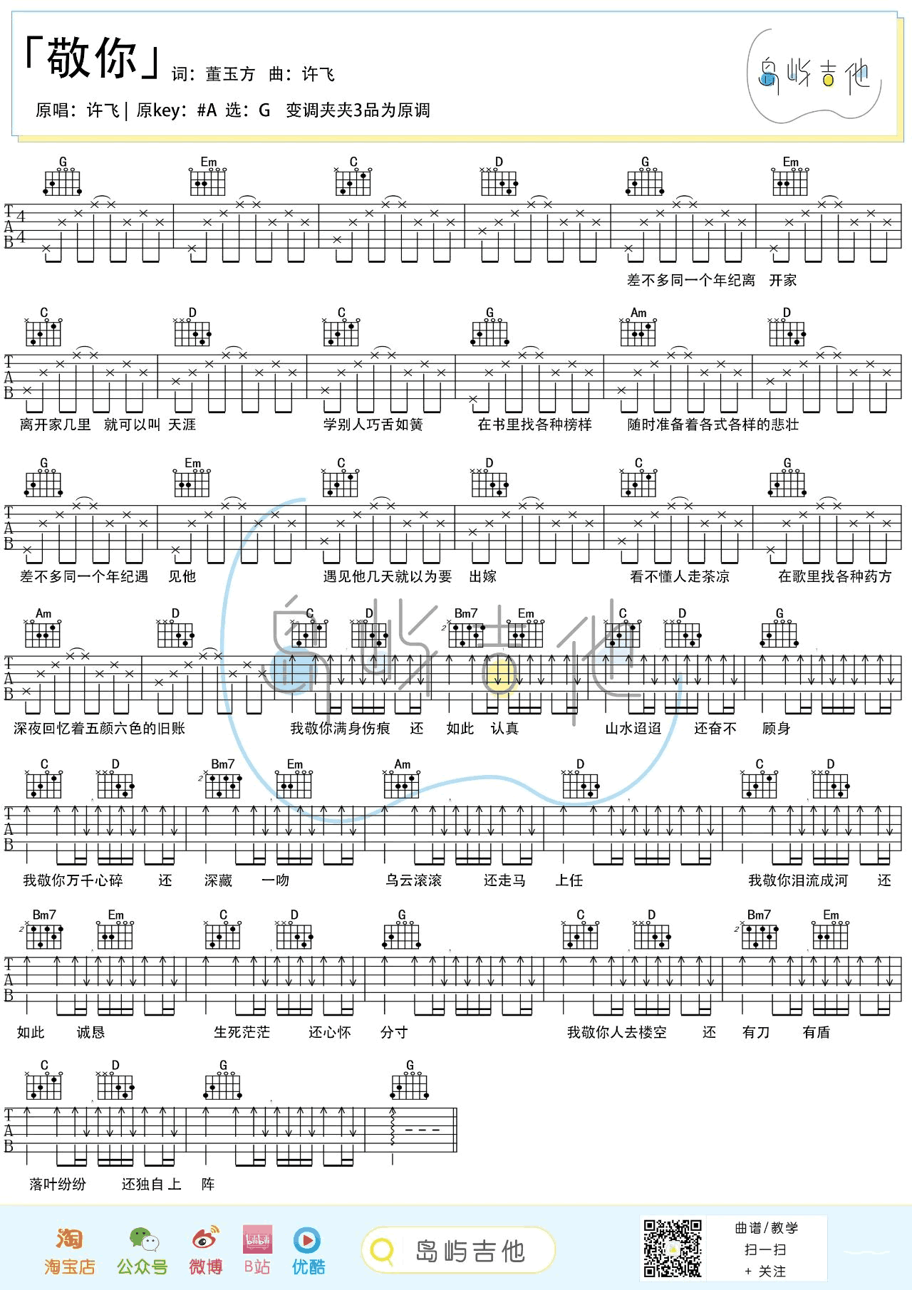 敬你吉他谱_许飞/万茜_《敬你》G调弹唱六线谱...