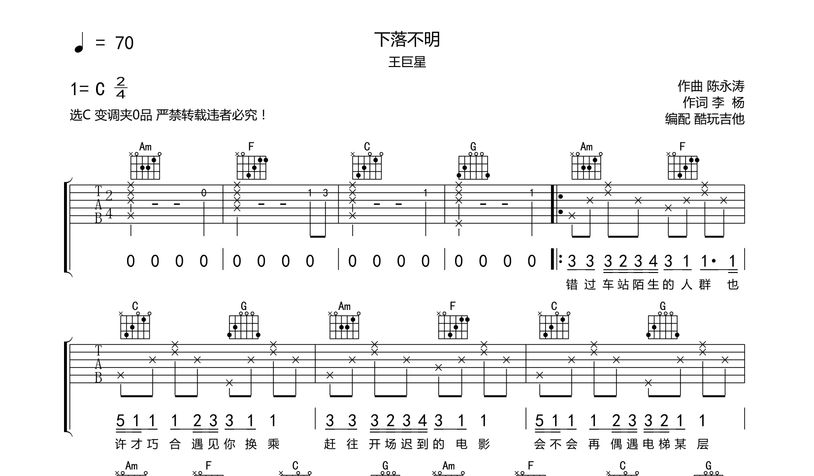 下落不明吉他谱-王巨星-C调六线谱弹唱谱变调夹0品音频为手机录制只是录制了第一遍到间奏以作示范间奏与尾奏根据个人主观编配...