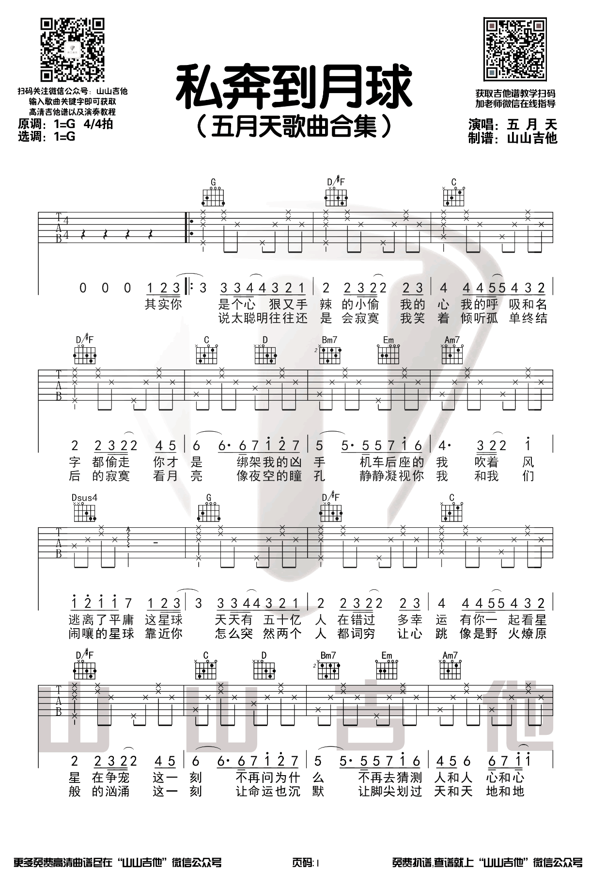 《私奔到月球》吉他谱_五月天/陈绮贞_G调弹唱谱...