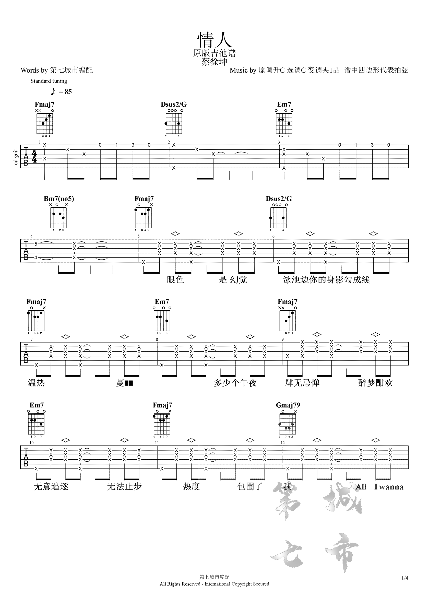 情人吉他谱_蔡徐坤_《情人》C调原版弹唱六线谱...