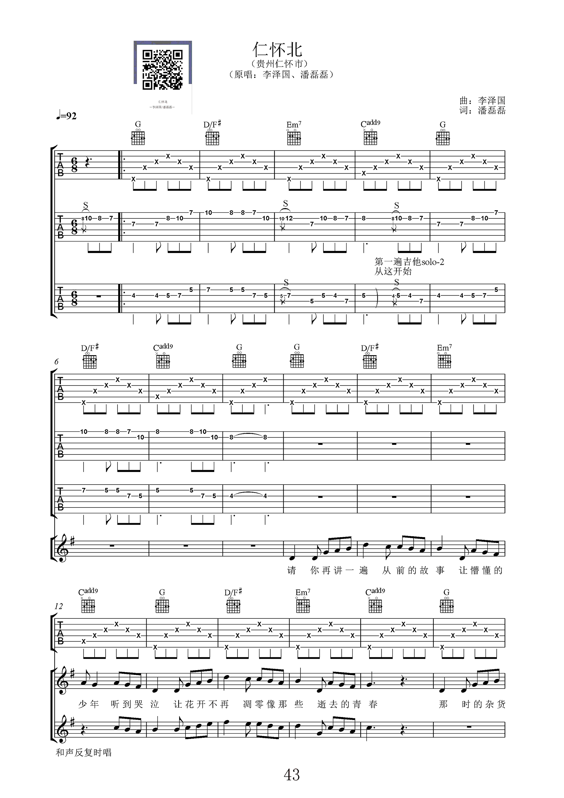 《仁怀北》吉他谱_李泽国/潘磊磊_G调原版弹唱谱...