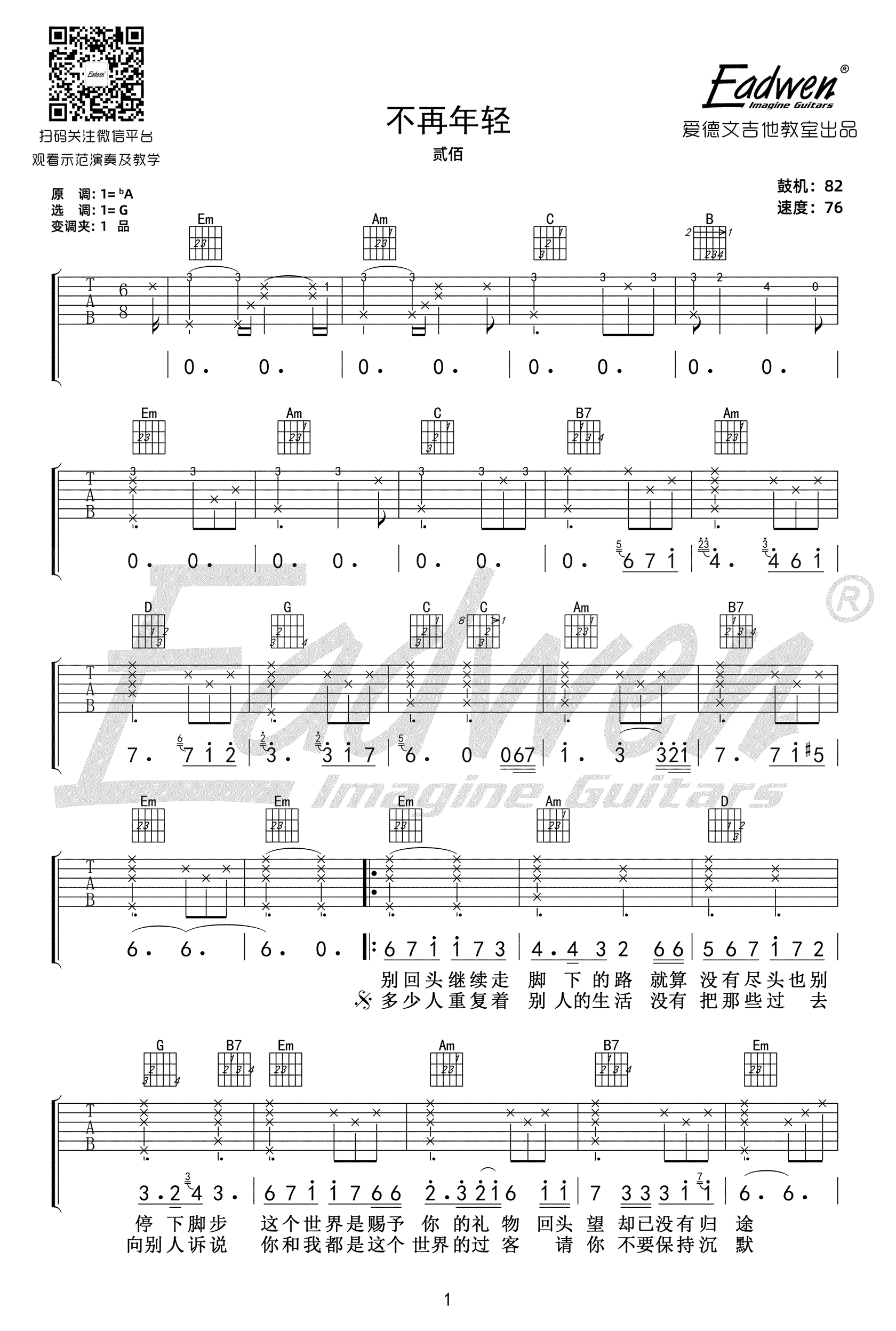 《不再年轻》吉他谱_贰佰_G调原版弹唱六线谱...