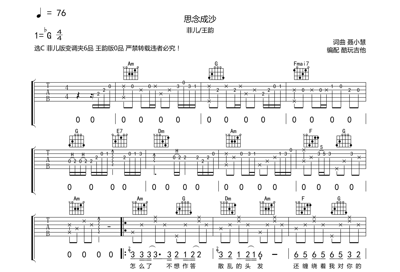 思念成沙吉他谱-菲儿/王韵-C调六线谱弹唱谱选C菲儿版变调夹6品王韵版0品音频为手机录制只是录制了第一遍到间奏结束以作示范...