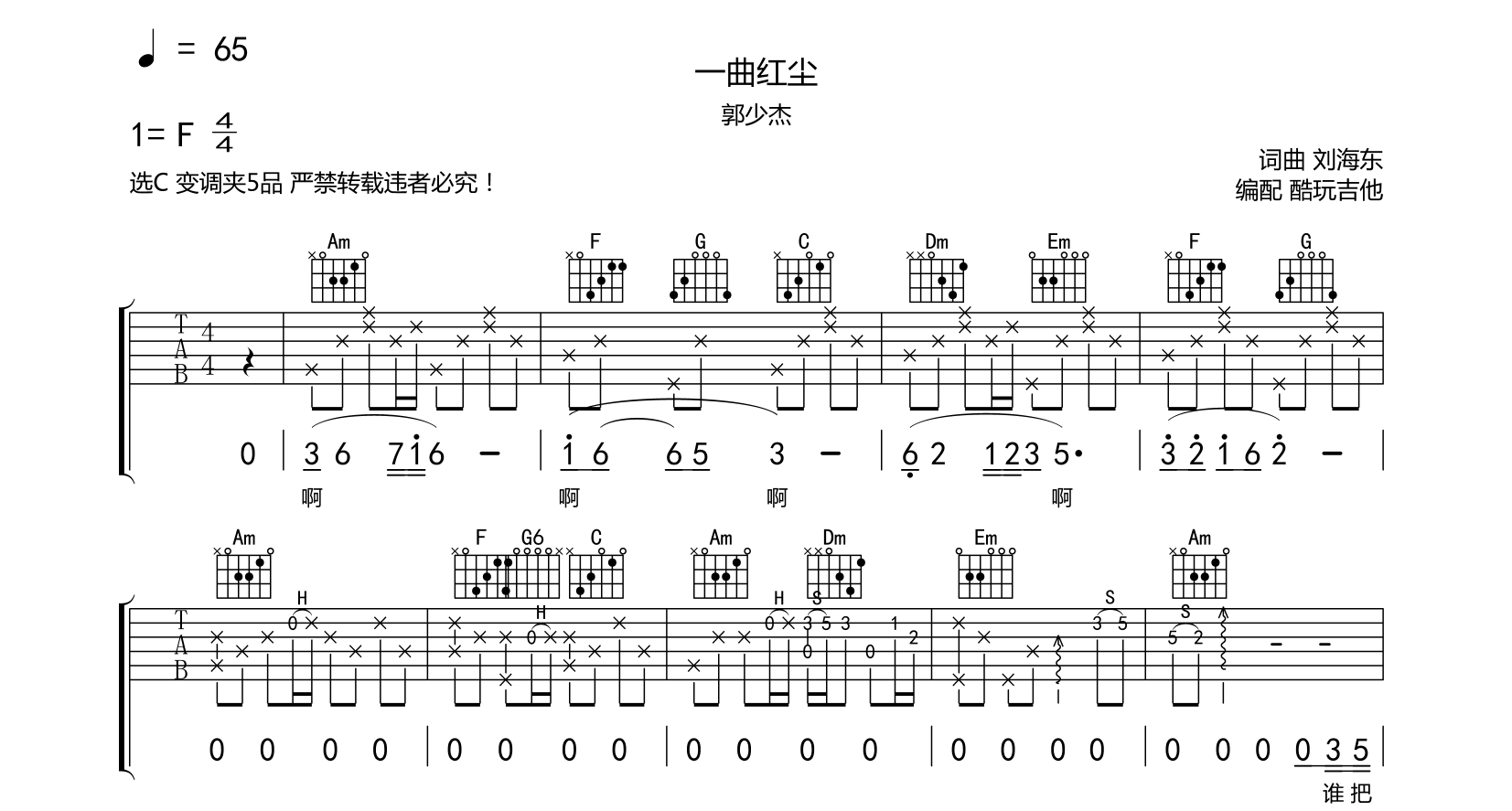 一曲红尘吉他谱-郭少杰-C调六线谱弹唱谱选C变调夹5品音频为手机录制只是录制了第一遍到间奏结束以作示范...
