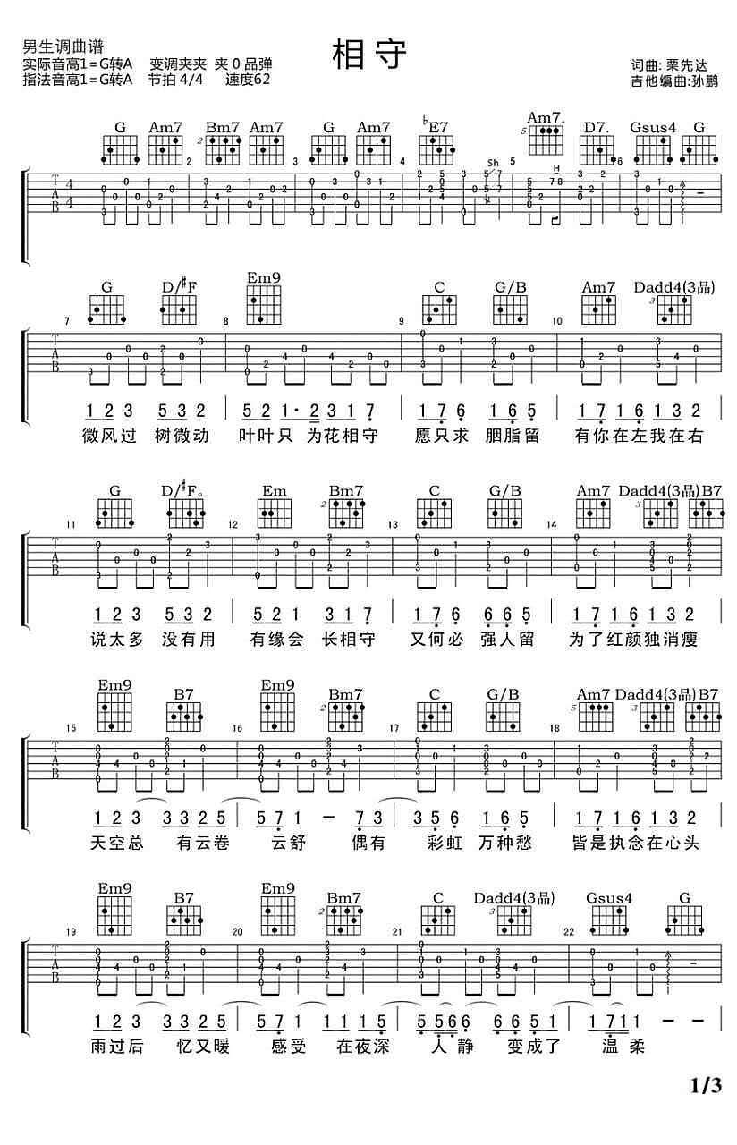 相守吉他谱_栗先达_G调原版六线谱弹唱...