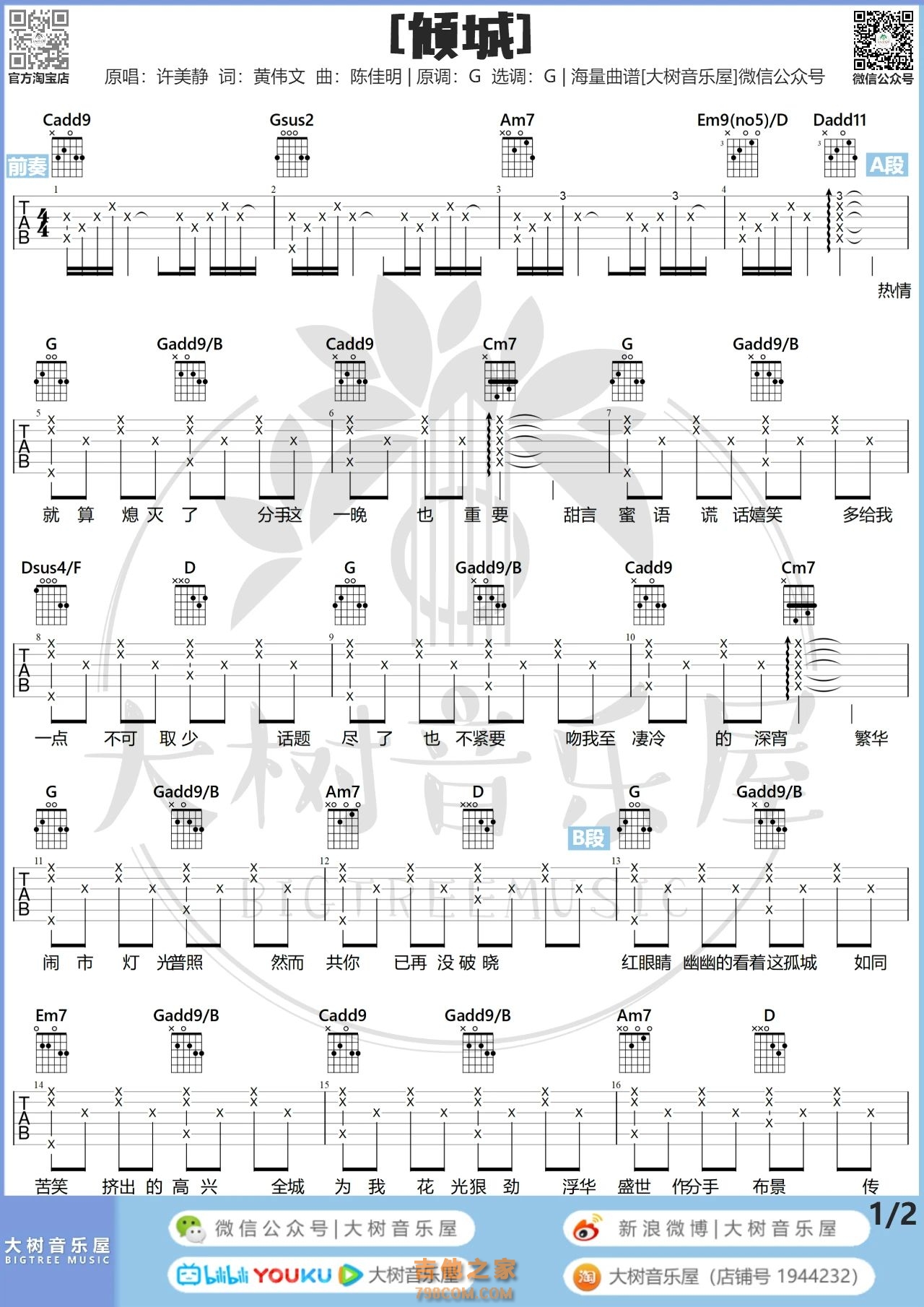 陈奕迅《倾城》吉他谱,倾城吉他谱G调...