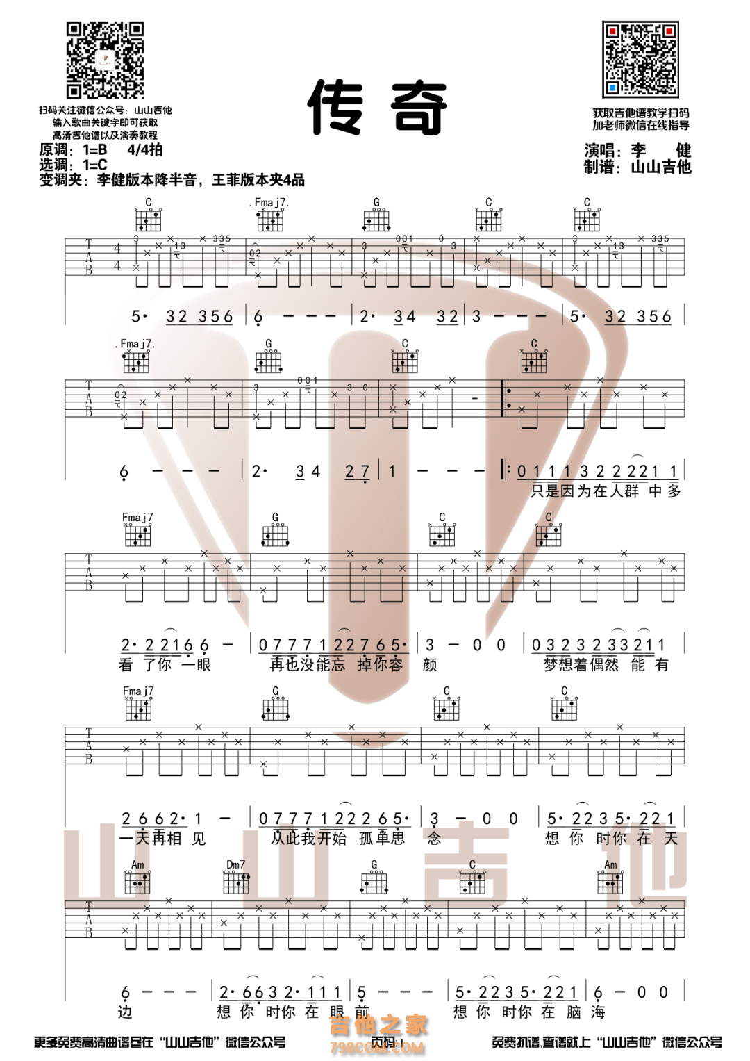 吉他李健《传奇》吉他谱-吉他谱C调