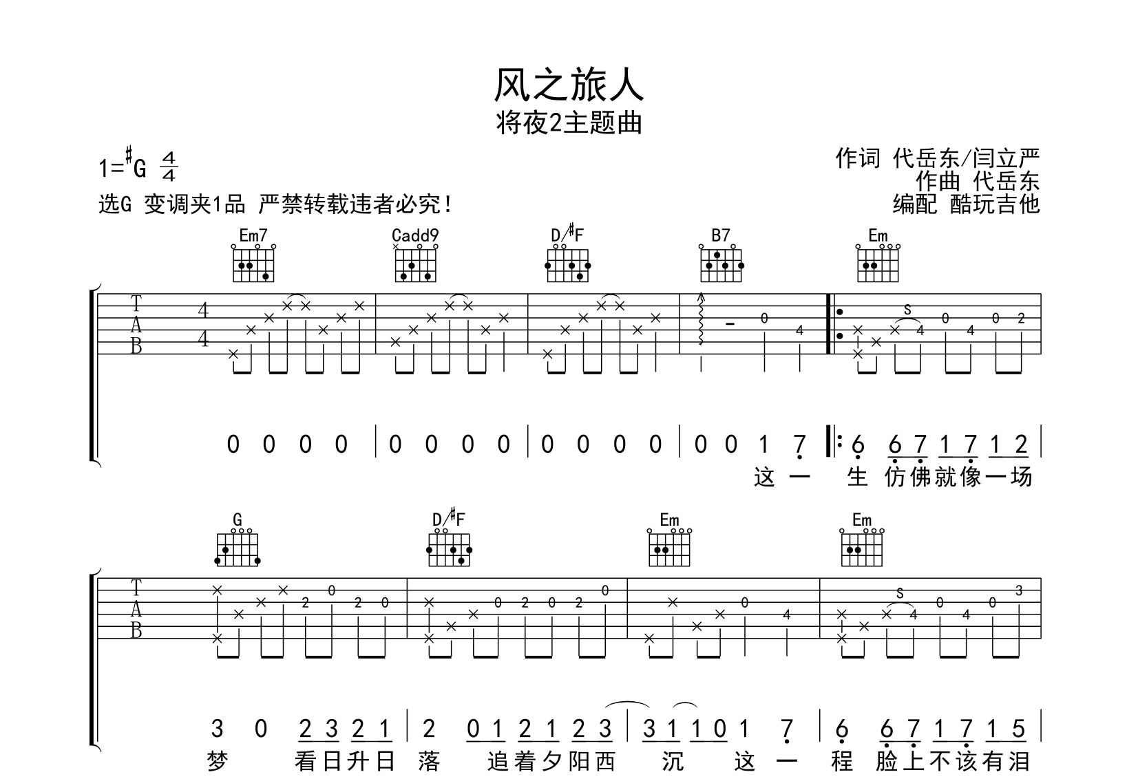 风之旅人指弹吉他谱-阿云噶-将夜2主题曲-G调指弹谱音频为手机录制只是录制到间奏结束以作示范试听...