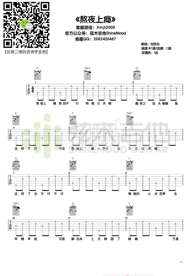 熬夜上瘾吉他谱-刘亦欣-C调六线谱弹唱...